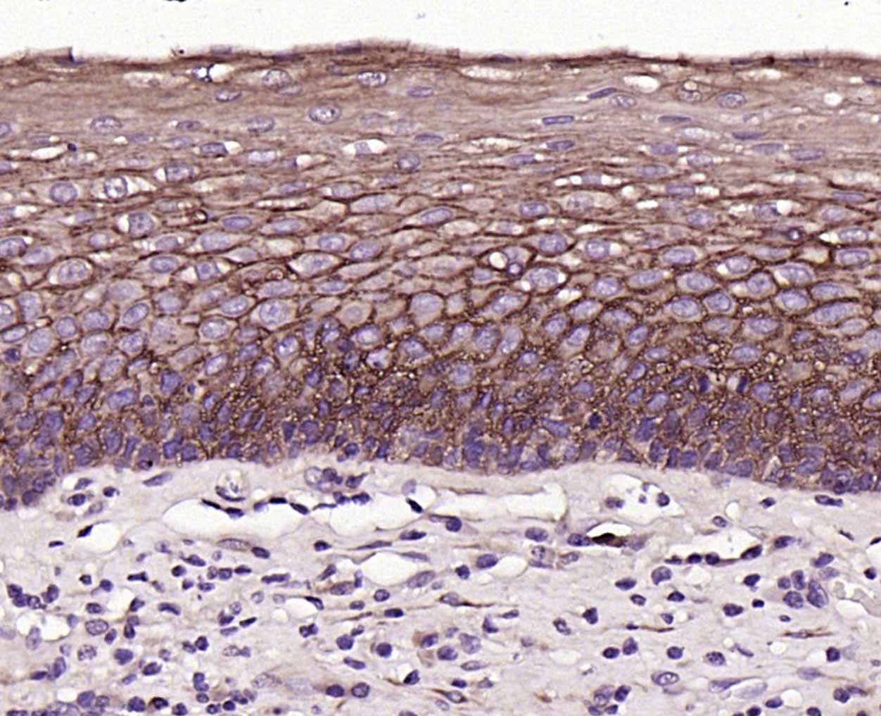 Paraformaldehyde-fixed, paraffin embedded (Human esophagus); Antigen retrieval by boiling in sodium citrate buffer (pH6.0) for 15min; Block endogenous peroxidase by 3% hydrogen peroxide for 20 minutes; Blocking buffer (normal goat serum) at 37°C for 30min; Incubation with (TROP2) Monoclonal Antibody, Unconjugated (bsm-43037M) at 1:200 overnight at 4°C, followed by operating according to SP Kit(Mouse)(sp-0024) instructionsand DAB staining.