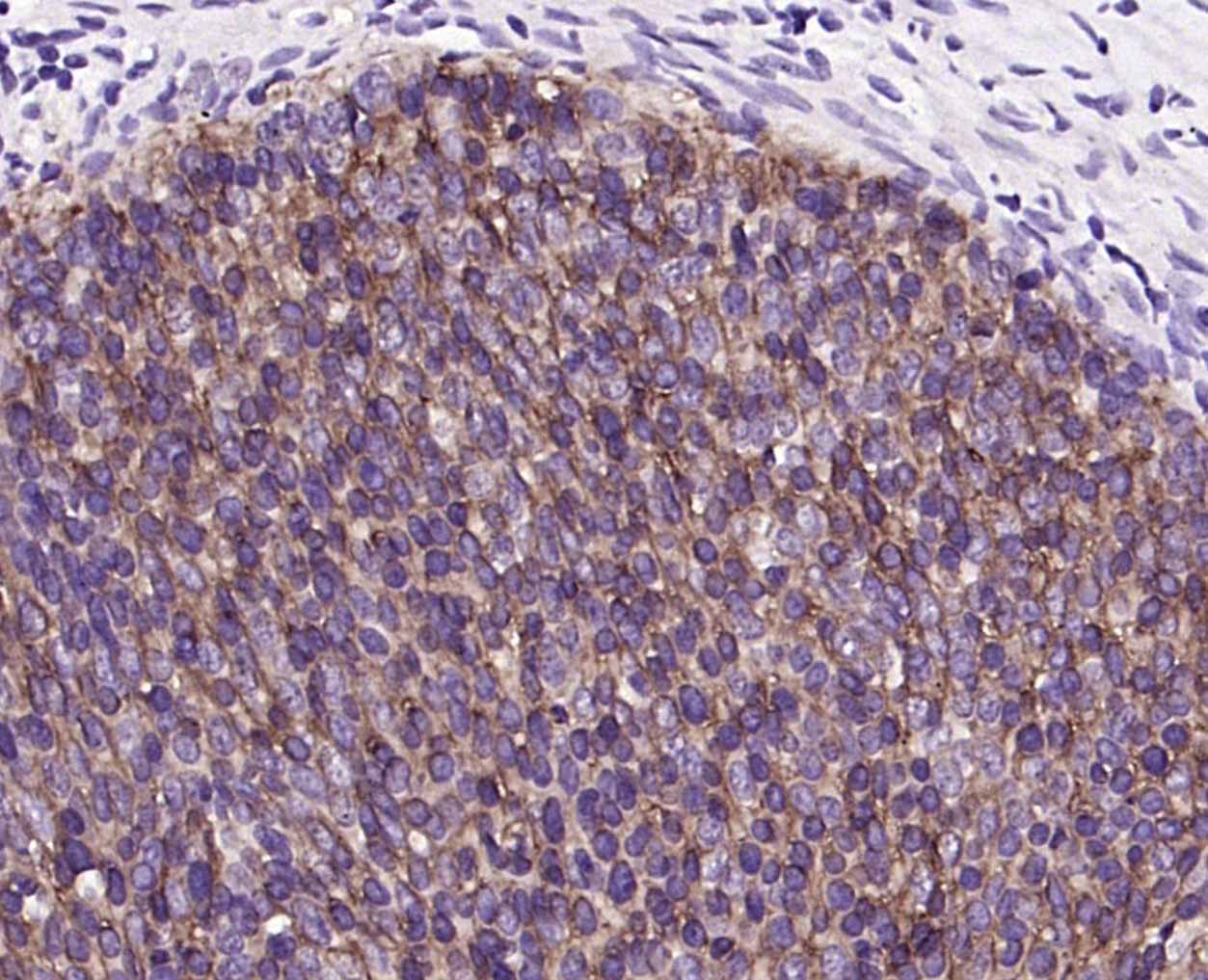 Paraformaldehyde-fixed, paraffin embedded (Human Cervical squamous epithelial lesions); Antigen retrieval by boiling in sodium citrate buffer (pH6.0) for 15min; Block endogenous peroxidase by 3% hydrogen peroxide for 20 minutes; Blocking buffer (normal goat serum) at 37°C for 30min; Incubation with (TROP2) Monoclonal Antibody, Unconjugated (bsm-43037M) at 1:200 overnight at 4°C, followed by operating according to SP Kit(Mouse)(sp-0024) instructionsand DAB staining.