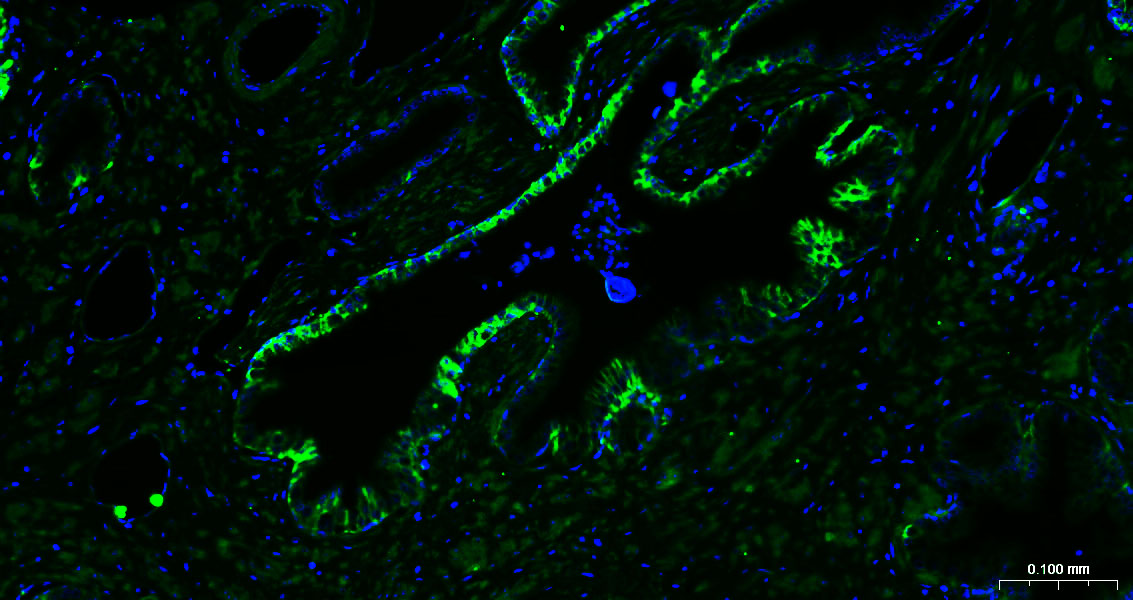 Paraformaldehyde-fixed, paraffin embedded Human Prostate; Antigen retrieval by boiling in sodium citrate buffer (pH6.0) for 15 min; Antibody incubation with TROP2 Monoclonal Antibody, Unconjugated (bsm-43037M) at 1:200 overnight at 4°C. Followed by conjugated Goat Anti-Mouse IgG antibody (green, bs-0296G-BF488), DAPI (blue, C02-04002) was used to stain the cell nuclei.
