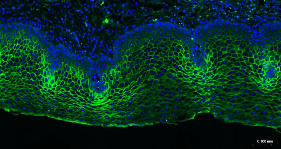 Paraformaldehyde-fixed, paraffin embedded Human Esophagus; Antigen retrieval by boiling in sodium citrate buffer (pH6.0) for 15 min; Antibody incubation with TROP2 Monoclonal Antibody, Unconjugated (bsm-43037M) at 1:200 overnight at 4°C. Followed by conjugated Goat Anti-Mouse IgG antibody (green, bs-0296G-BF488), DAPI (blue, C02-04002) was used to stain the cell nuclei.
