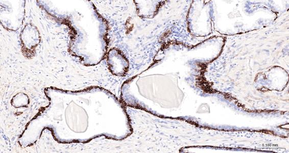 Paraformaldehyde-fixed, paraffin embedded Human Prostate; Antigen retrieval by boiling in sodium citrate buffer (pH6.0) for 15 min; Antibody incubation with NGFR Monoclonal Antibody, Unconjugated(bsm-43637M) at 1:200 overnight at 4°C, followed by conjugation to the bs-40296G-HRP and DAB (C-0010) staining.