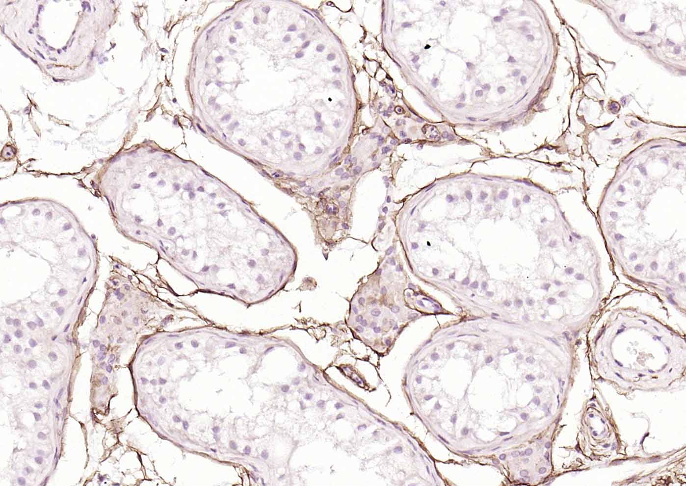 Paraformaldehyde-fixed, paraffin embedded (Human Testicles); Antigen retrieval by boiling in sodium citrate buffer (pH6.0) for 15min; Block endogenous peroxidase by 3% hydrogen peroxide for 20 minutes; Blocking buffer (normal goat serum) at 37°C for 30min; Incubation with (NGFR) Monoclonal Antibody, Unconjugated (bsm-43637M) at 1:2000 overnight at 4°C, followed by operating according to SP Kit(Mouse)(sp-0024) instructionsand DAB staining.