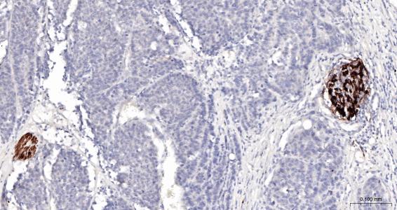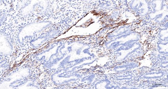 Paraformaldehyde-fixed, paraffin embedded Human Uterus; Antigen retrieval by boiling in sodium citrate buffer (pH6.0) for 15 min; Antibody incubation with NGFR Monoclonal Antibody, Unconjugated(bsm-43637M) at 1:200 overnight at 4°C, followed by conjugation to the bs-40296G-HRP and DAB (C-0010) staining.