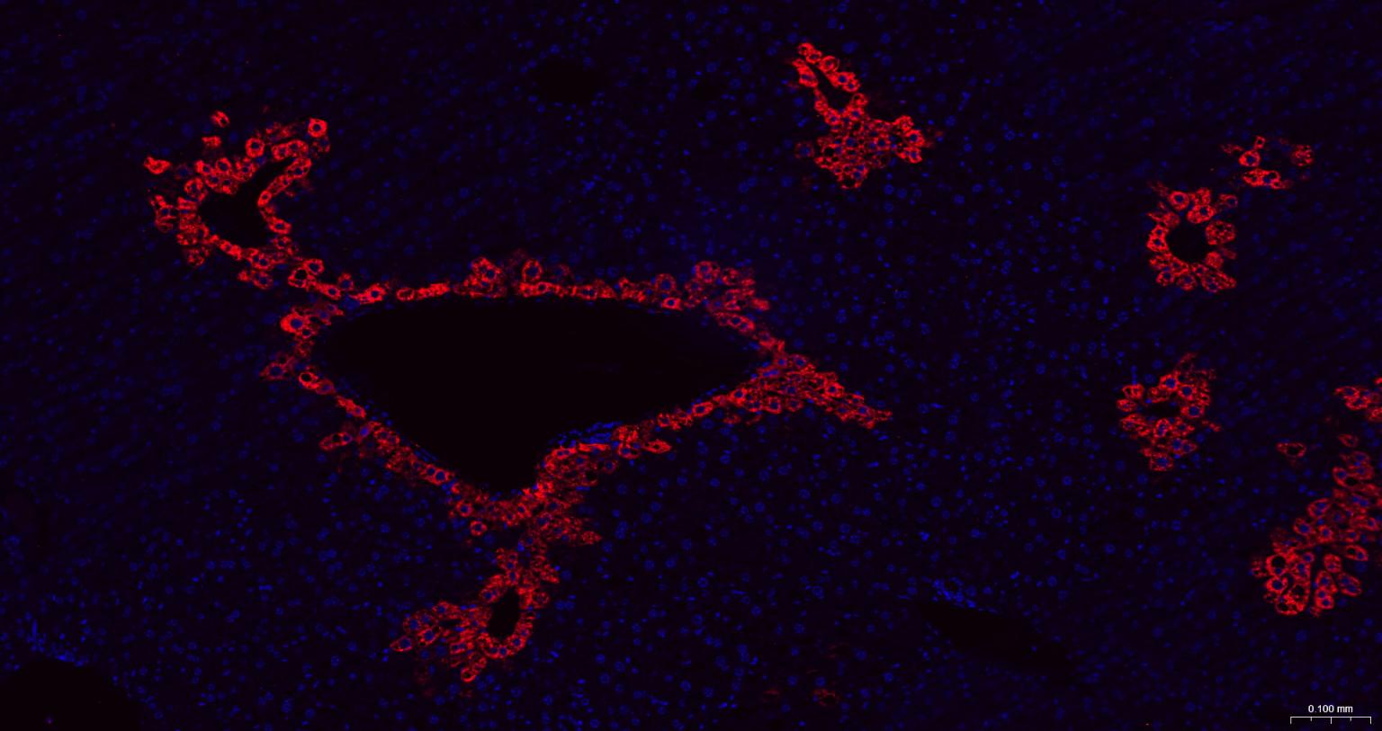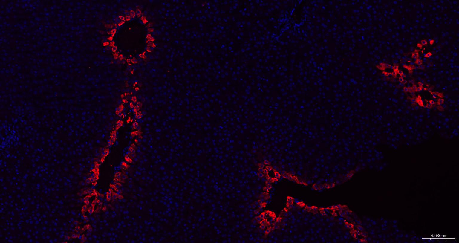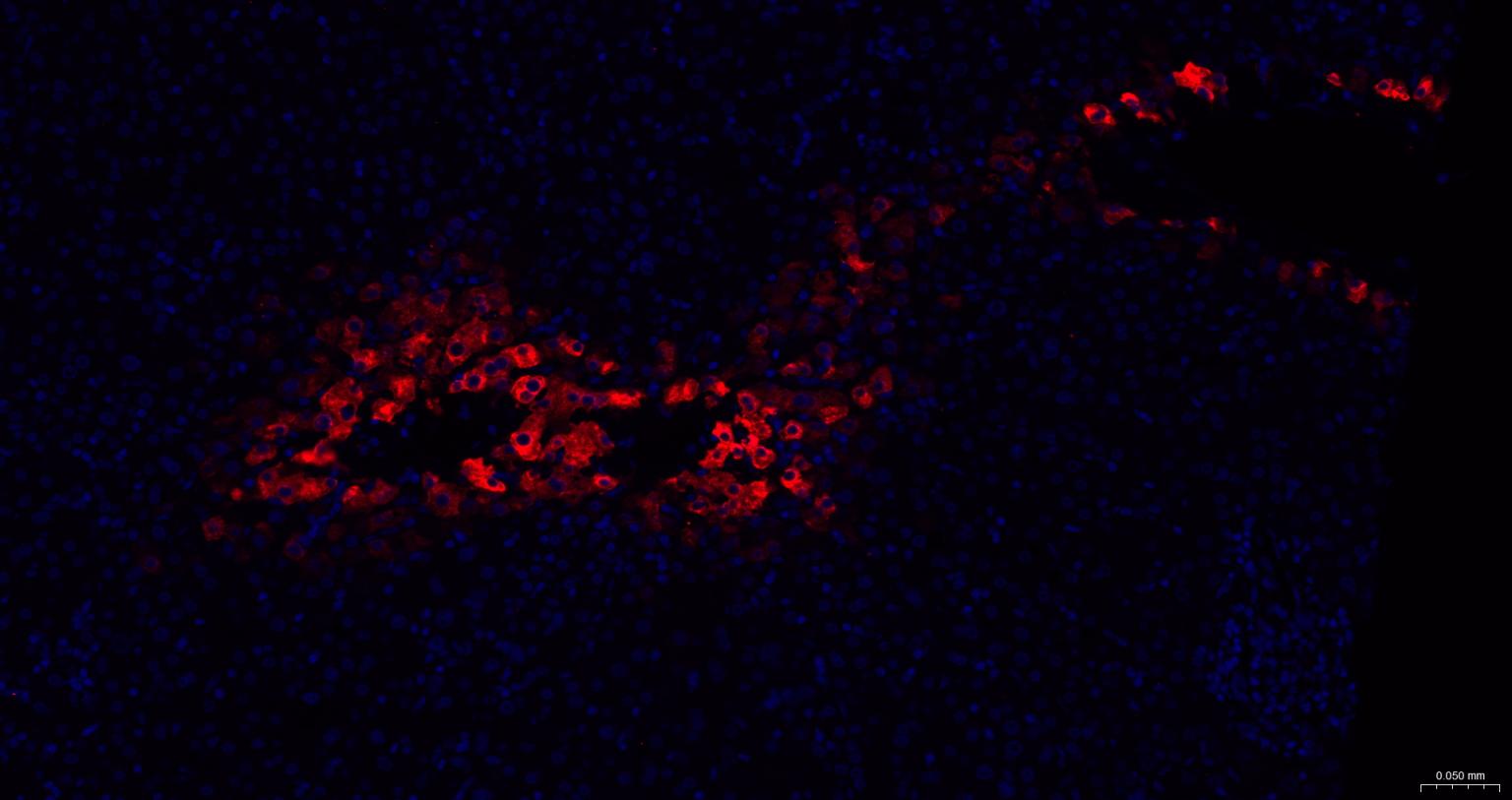 Paraformaldehyde-fixed, paraffin embedded Mouse Liver; Antigen retrieval by boiling in sodium citrate buffer (pH6.0) for 15 min; The section was incubated with Glutamine synthetase Polyclonal Antibody, Unconjugated (bs-42310R) at 1:200 overnight at 4°C. Followed by conjugated Goat Anti-Rabbit IgG antibody (Red, bs-0295G-BF594), DAPI (blue, C02-04002) was used to stain the cell nuclei.