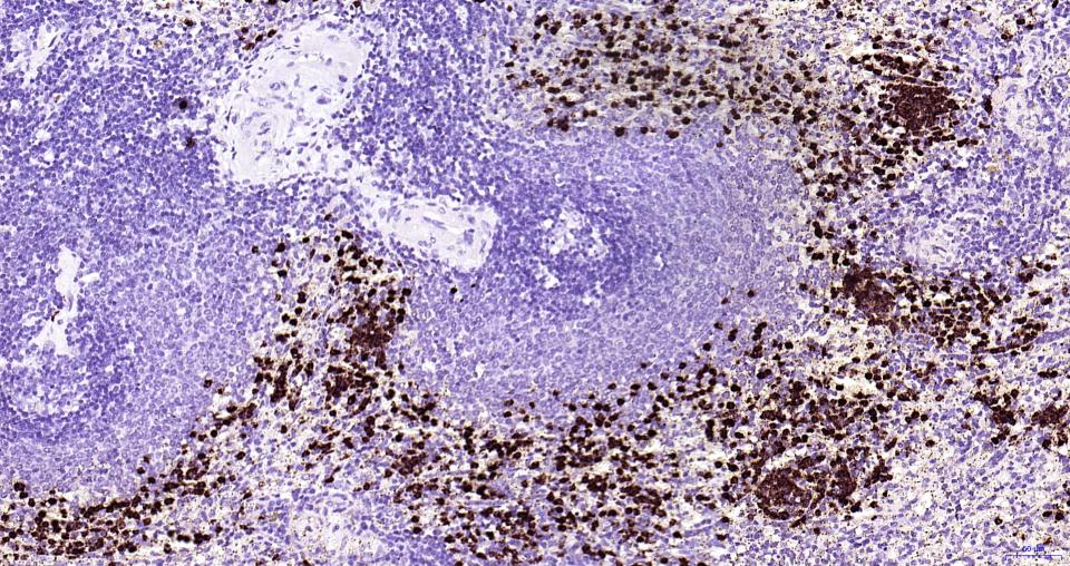 Paraformaldehyde-fixed, paraffin embedded Human spleen; Antigen retrieval by boiling in sodium citrate buffer (pH6.0) for 15 min; Antibody incubation with PR3 Monoclonal Antibody, Unconjugated(bsm-43164M) at 1:200 overnight at 4°C, followed by conjugation to the bs-40296G-HRP and DAB (C-0010) staining.