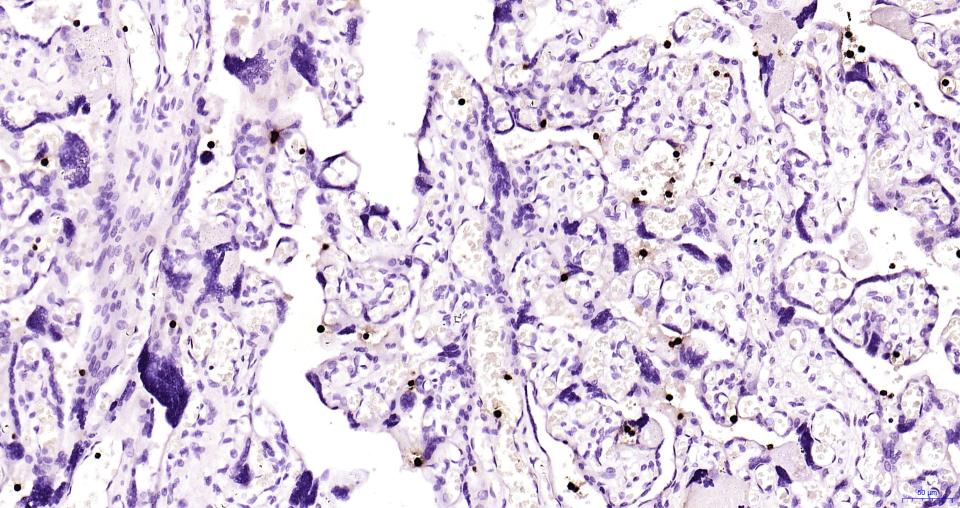 Paraformaldehyde-fixed, paraffin embedded Human placenta; Antigen retrieval by boiling in sodium citrate buffer (pH6.0) for 15 min; Antibody incubation with PR3 Monoclonal Antibody, Unconjugated(bsm-43164M) at 1:200 overnight at 4°C, followed by conjugation to the bs-40296G-HRP and DAB (C-0010) staining.