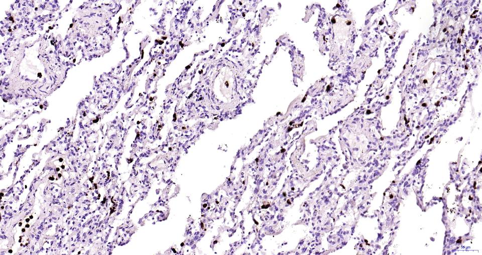 Paraformaldehyde-fixed, paraffin embedded Human lung; Antigen retrieval by boiling in sodium citrate buffer (pH6.0) for 15 min; Antibody incubation with PR3 Monoclonal Antibody, Unconjugated(bsm-43164M) at 1:200 overnight at 4°C, followed by conjugation to the bs-40296G-HRP and DAB (C-0010) staining.