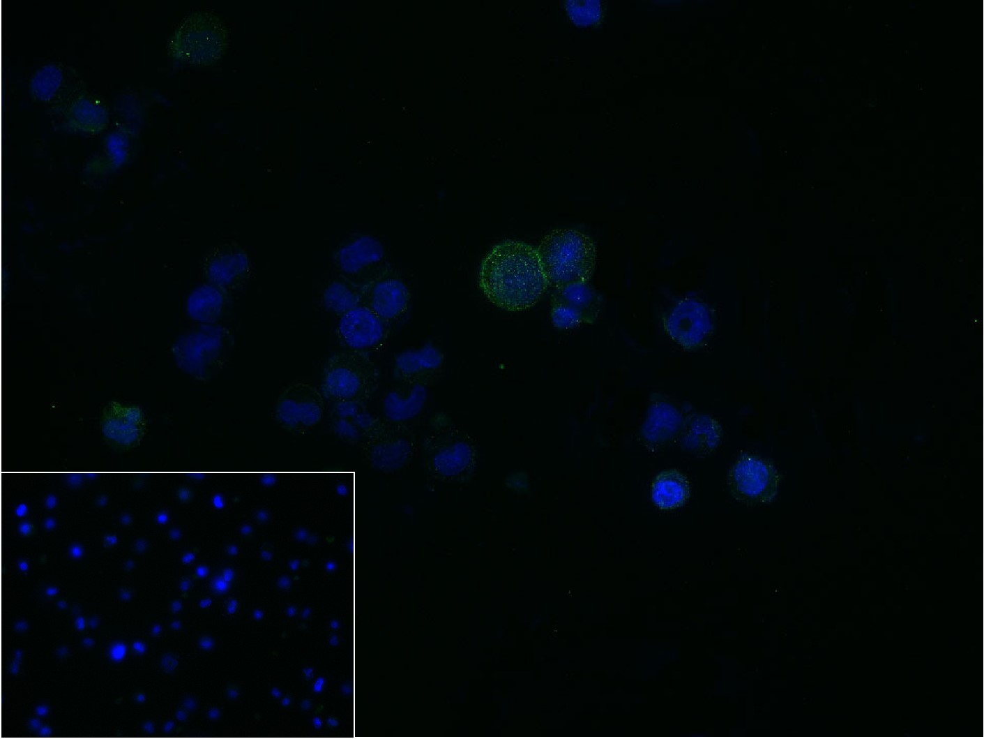4% Paraformaldehyde-fixed HL-60 (H) cell; Triton X-100 at r.t. for 20 min; Antibody incubation with (PR3) monoclonal Antibody, unconjugated (bsm-43164M) 1:100, 90 min at 37°C; followed by conjugated Goat Anti-Mouse IgG antibody (green, bs-60296G-FITC) at 37°C for 90 min, DAPI (blue, C02-04002) was used to stain the cell nuclei. PBS instead of the primary antibody was used as the blank control.