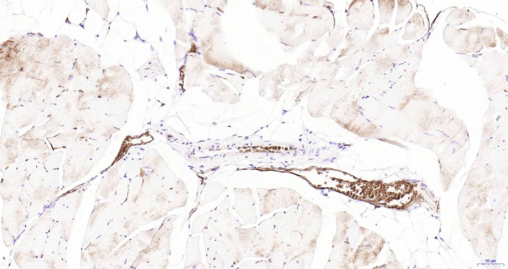 Paraformaldehyde-fixed, paraffin embedded Rat Skeletal muscle; Antigen retrieval by boiling in sodium citrate buffer (pH6.0) for 15 min; Antibody incubation with AQP1 Monoclonal Antibody, Unconjugated(bsm-52909R) at 1:200 overnight at 4°C, followed by conjugation to the SP Kit(Rabbit, SP-0023) and DAB (C-0010) staining.