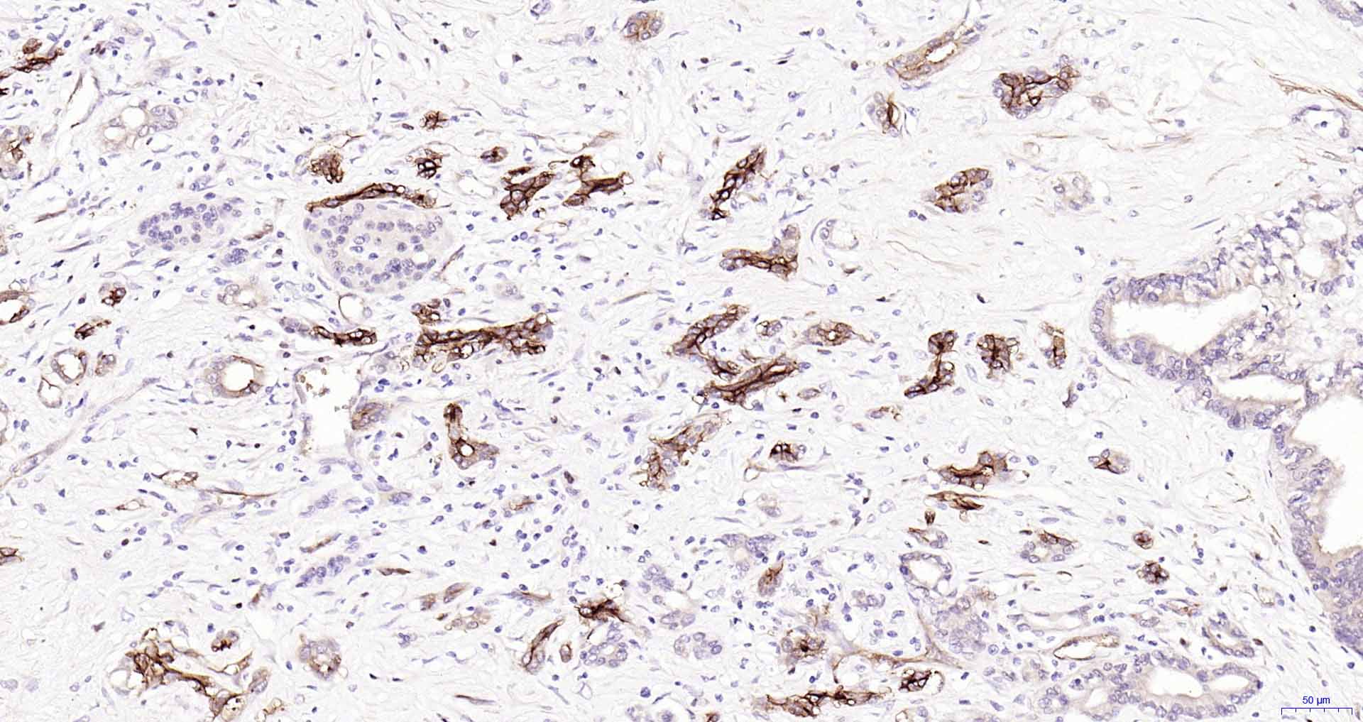 Paraformaldehyde-fixed, paraffin embedded Human Pancreatic Cancer; Antigen retrieval by boiling in sodium citrate buffer (pH6.0) for 15 min; Antibody incubation with AQP1 Monoclonal Antibody, Unconjugated(bsm-52909R) at 1:200 overnight at 4°C, followed by conjugation to the SP Kit(Rabbit, SP-0023) and DAB (C-0010) staining.