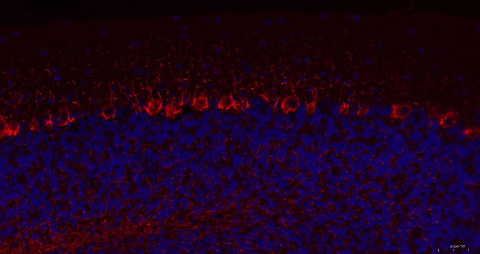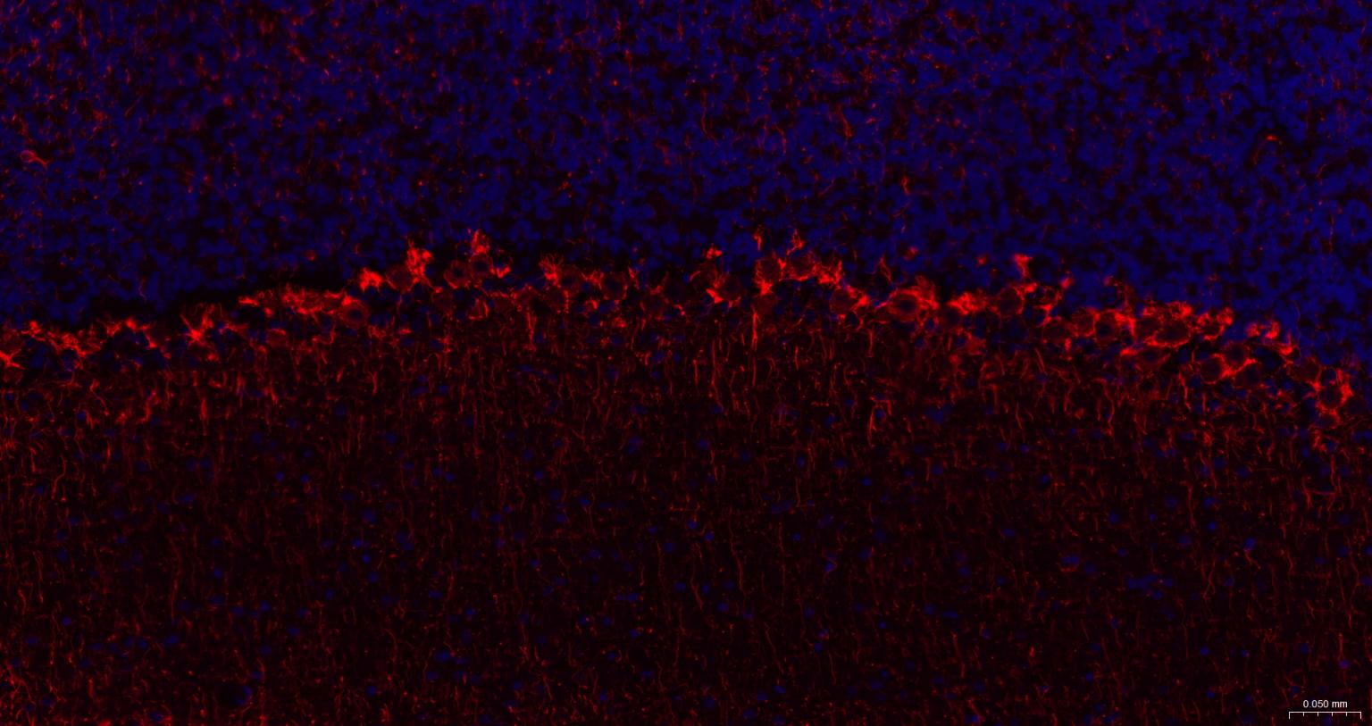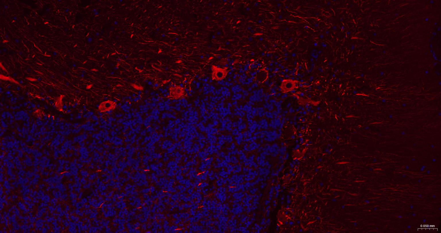 Paraformaldehyde-fixed, paraffin embedded Mouse Cerebellum; Antigen retrieval by boiling in sodium citrate buffer (pH6.0) for 15 min; The section was incubated with NF-H Monoclonal Antibody, Unconjugated (bsm-60885R) at 1:200 overnight at 4°C. Followed by conjugated Goat Anti-Rabbit IgG antibody (Red, bs-0295G-BF594), DAPI (blue, C02-04002) was used to stain the cell nuclei.