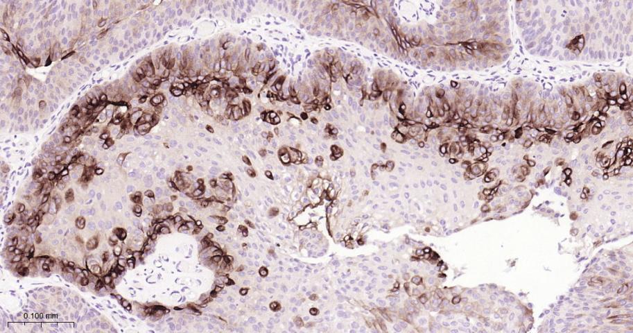 Paraformaldehyde-fixed, paraffin embedded Human Bladder; Antigen retrieval by boiling in sodium citrate buffer (pH6.0) for 15 min; Antibody incubation with UPK3A Monoclonal Antibody, Unconjugated(bsm-61004R) at 1:400 overnight at 4°C, followed by conjugation to the bs-0295G-HRP and DAB (C-0010) staining.