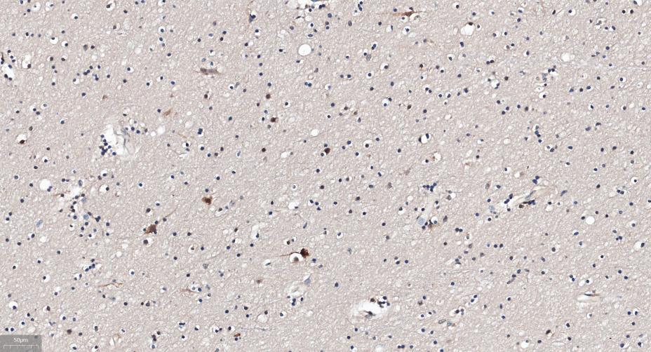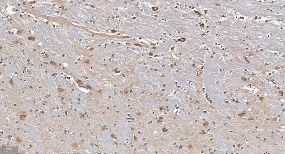 Paraformaldehyde-fixed, paraffin embedded Human Left Parietal Lobe; Antigen retrieval by boiling in sodium citrate buffer (pH6.0) for 15 min; Antibody incubation with GABARAP Monoclonal Antibody, Unconjugated(bsm-61023R) at 1:300 overnight at 4°C, followed by conjugation to the SP Kit (Rabbit, SP-0023)and DAB (C-0010) staining.