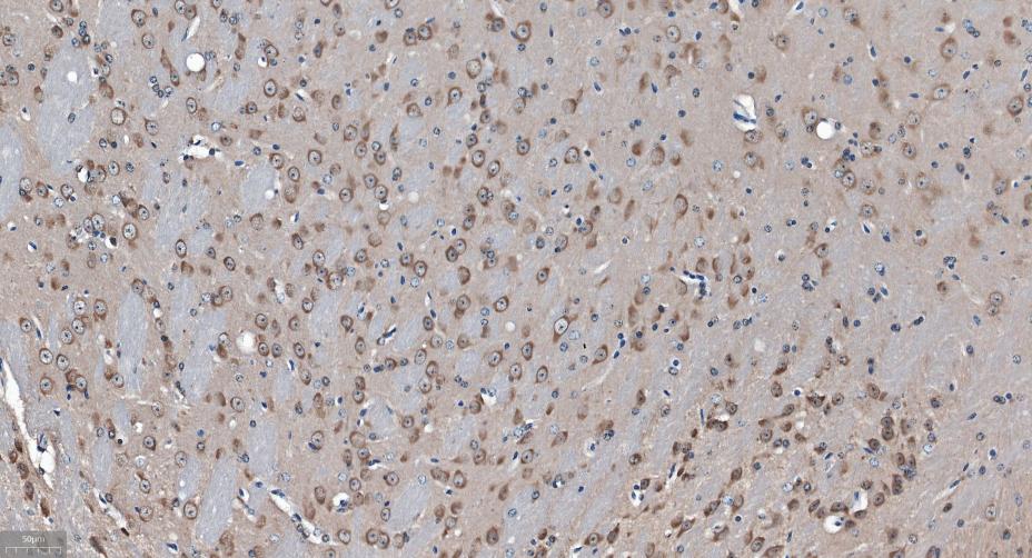 Paraformaldehyde-fixed, paraffin embedded Rat Cerebrum; Antigen retrieval by boiling in sodium citrate buffer (pH6.0) for 15 min; Antibody incubation with GABARAP Monoclonal Antibody, Unconjugated(bsm-61023R) at 1:300 overnight at 4°C, followed by conjugation to the SP Kit (Rabbit, SP-0023)and DAB (C-0010) staining.