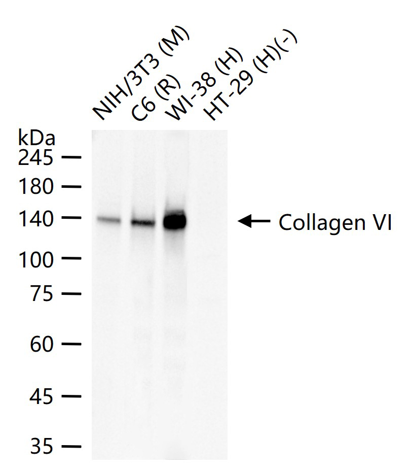 25 ug total protein per lane of various lysates (see on figure) probed with Collagen VI monoclonal antibody, unconjugated (bsm-61026R) at 1:1000 dilution and 4°C overnight incubation. Followed by conjugated secondary antibody incubation at r.t. for 60 min.