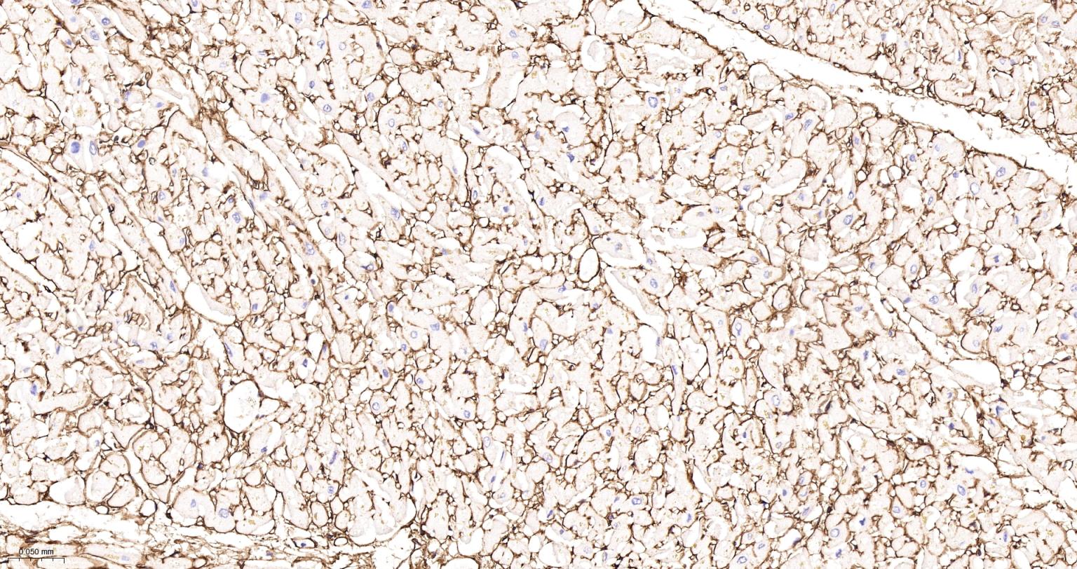 Paraformaldehyde-fixed, paraffin embedded Human Heart; Antigen retrieval by boiling in sodium citrate buffer (pH6.0) for 15 min; Antibody incubation with Collagen VI Monoclonal Antibody, Unconjugated(bsm-61026R) at 1:300 overnight at 4°C, followed by conjugation to the SP Kit(Rabbit, SP-0023) and DAB (C-0010) staining.