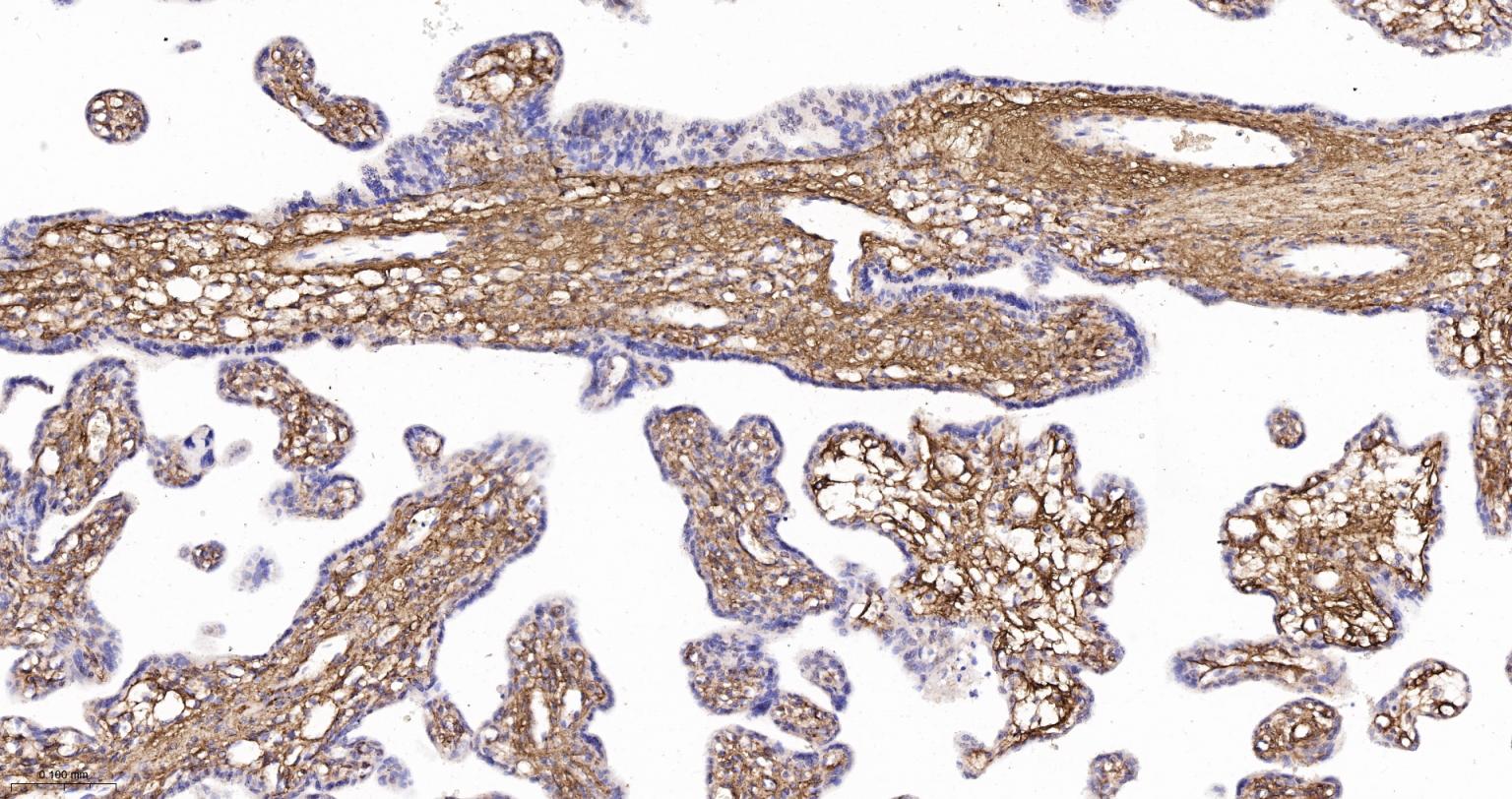 Paraformaldehyde-fixed, paraffin embedded Human Placenta; Antigen retrieval by boiling in sodium citrate buffer (pH6.0) for 15 min; Antibody incubation with Collagen VI Monoclonal Antibody, Unconjugated(bsm-61026R) at 1:300 overnight at 4°C, followed by conjugation to the SP Kit(Rabbit, SP-0023) and DAB (C-0010) staining.