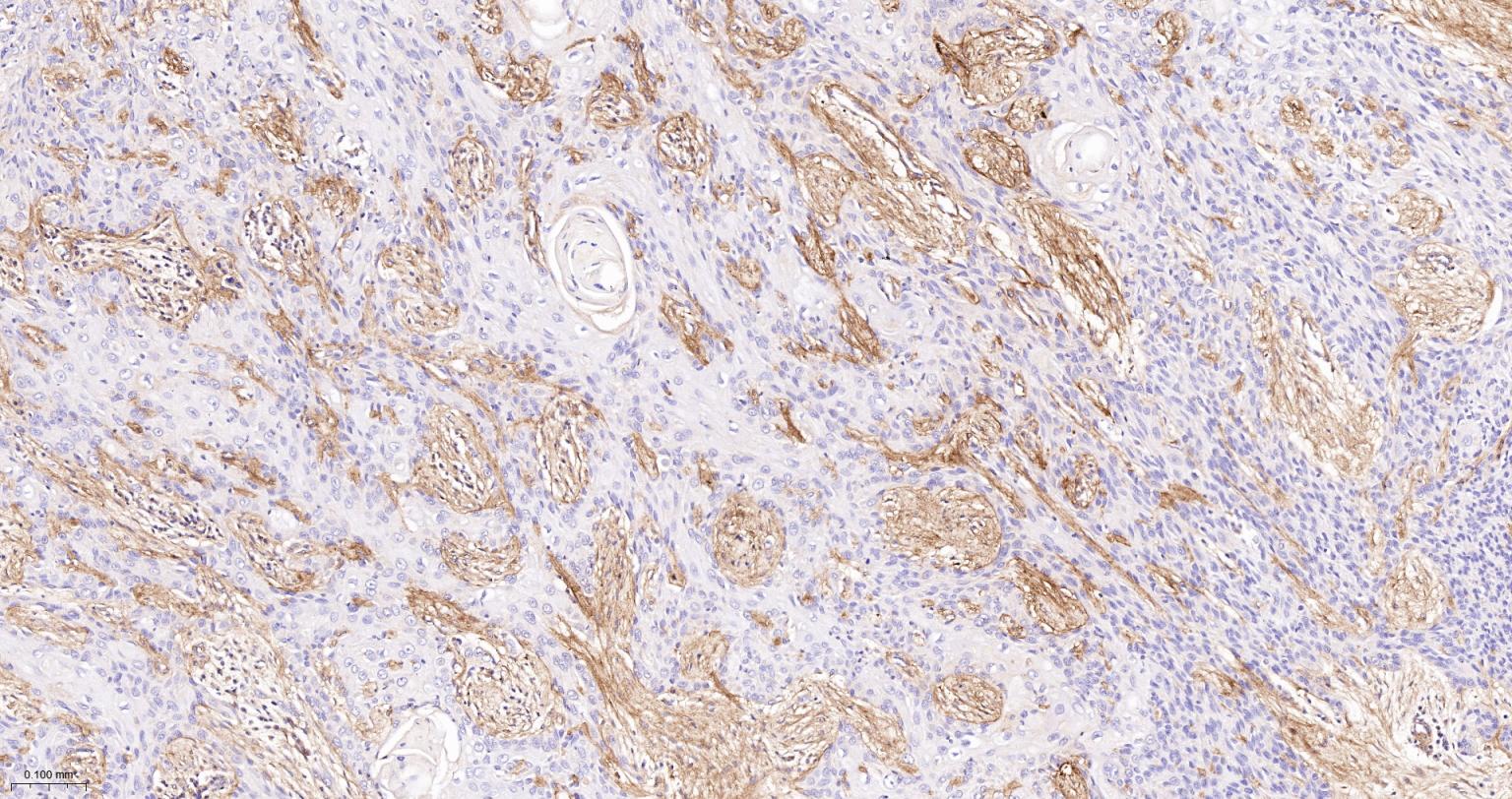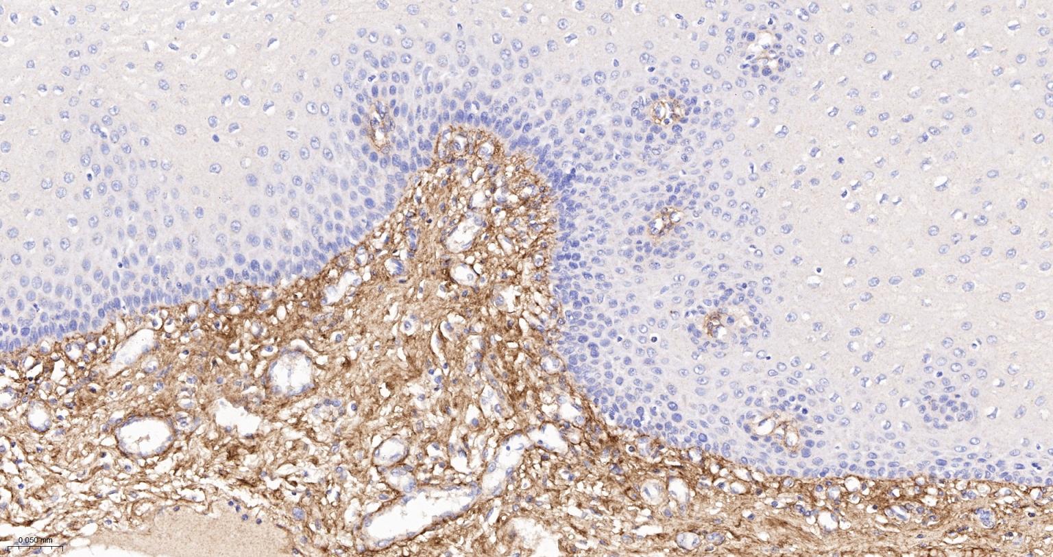 Paraformaldehyde-fixed, paraffin embedded Human Esophagus; Antigen retrieval by boiling in sodium citrate buffer (pH6.0) for 15 min; Antibody incubation with Collagen VI Monoclonal Antibody, Unconjugated(bsm-61026R) at 1:300 overnight at 4°C, followed by conjugation to the SP Kit(Rabbit, SP-0023) and DAB (C-0010) staining.