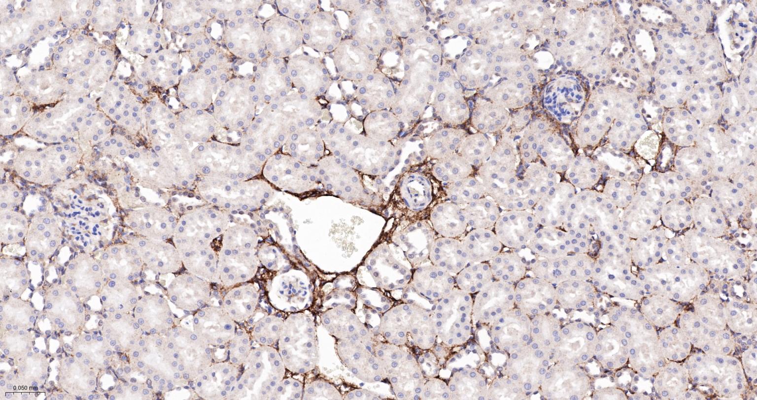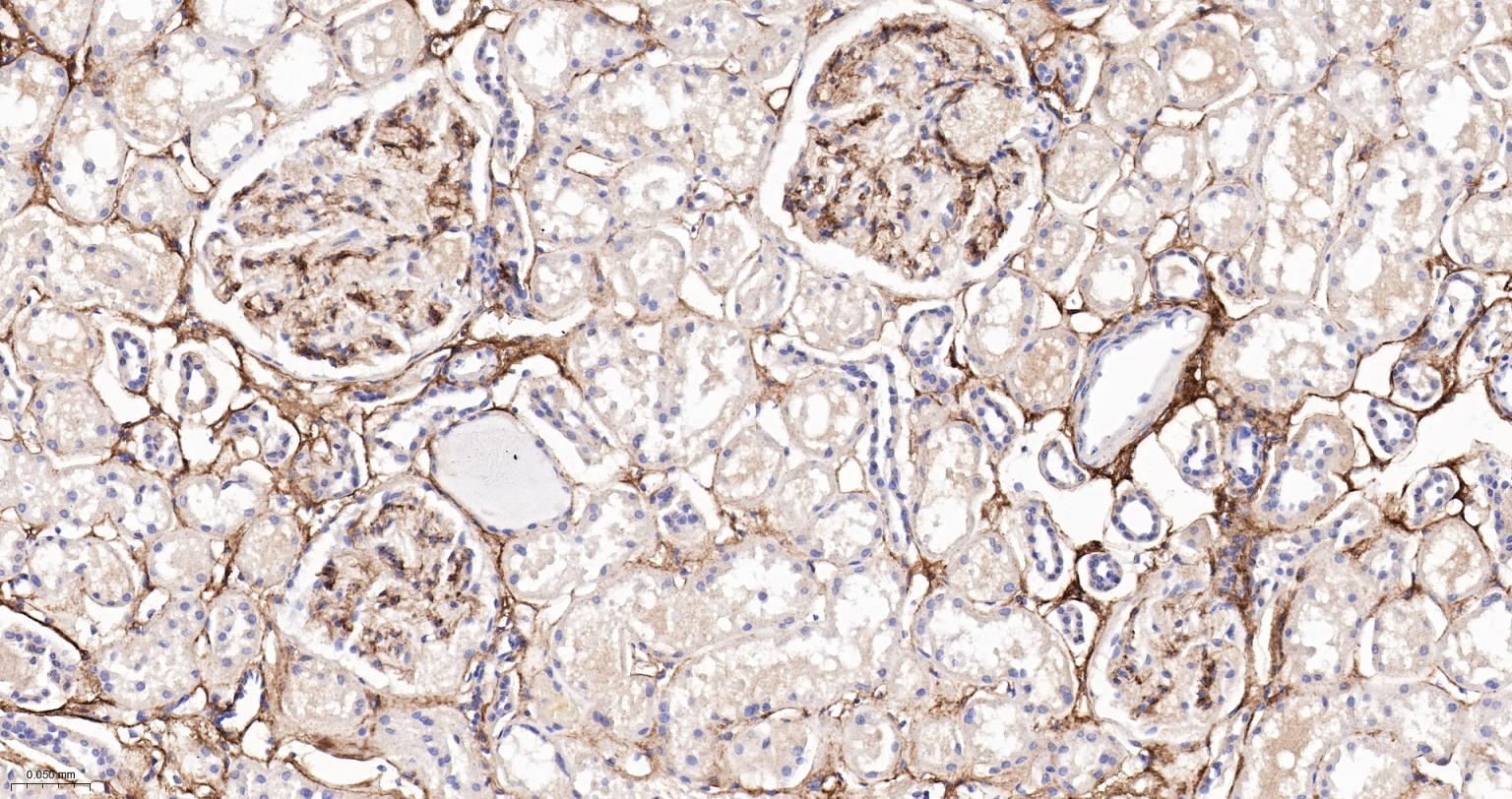 Paraformaldehyde-fixed, paraffin embedded Rat Kidney; Antigen retrieval by boiling in sodium citrate buffer (pH6.0) for 15 min; The section was incubated with Collagen VI Monoclonal Antibody, Unconjugated (bsm-61026R) at 1:200 overnight at 4°C, followed by conjugation to the bs-0295G-HRP and DAB (C-0010) staining.
