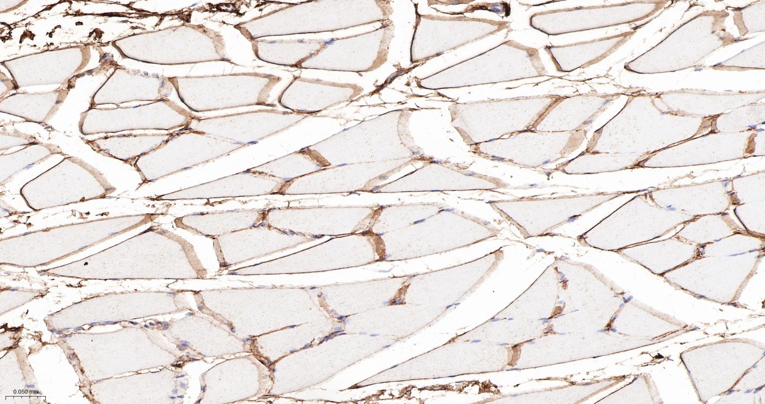 Paraformaldehyde-fixed, paraffin embedded Mouse Skeletal muscle; Antigen retrieval by boiling in sodium citrate buffer (pH6.0) for 15 min; The section was incubated with Collagen VI Monoclonal Antibody, Unconjugated (bsm-61026R) at 1:200 overnight at 4°C, followed by conjugation to the bs-0295G-HRP and DAB (C-0010) staining.