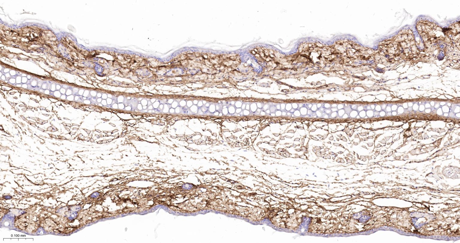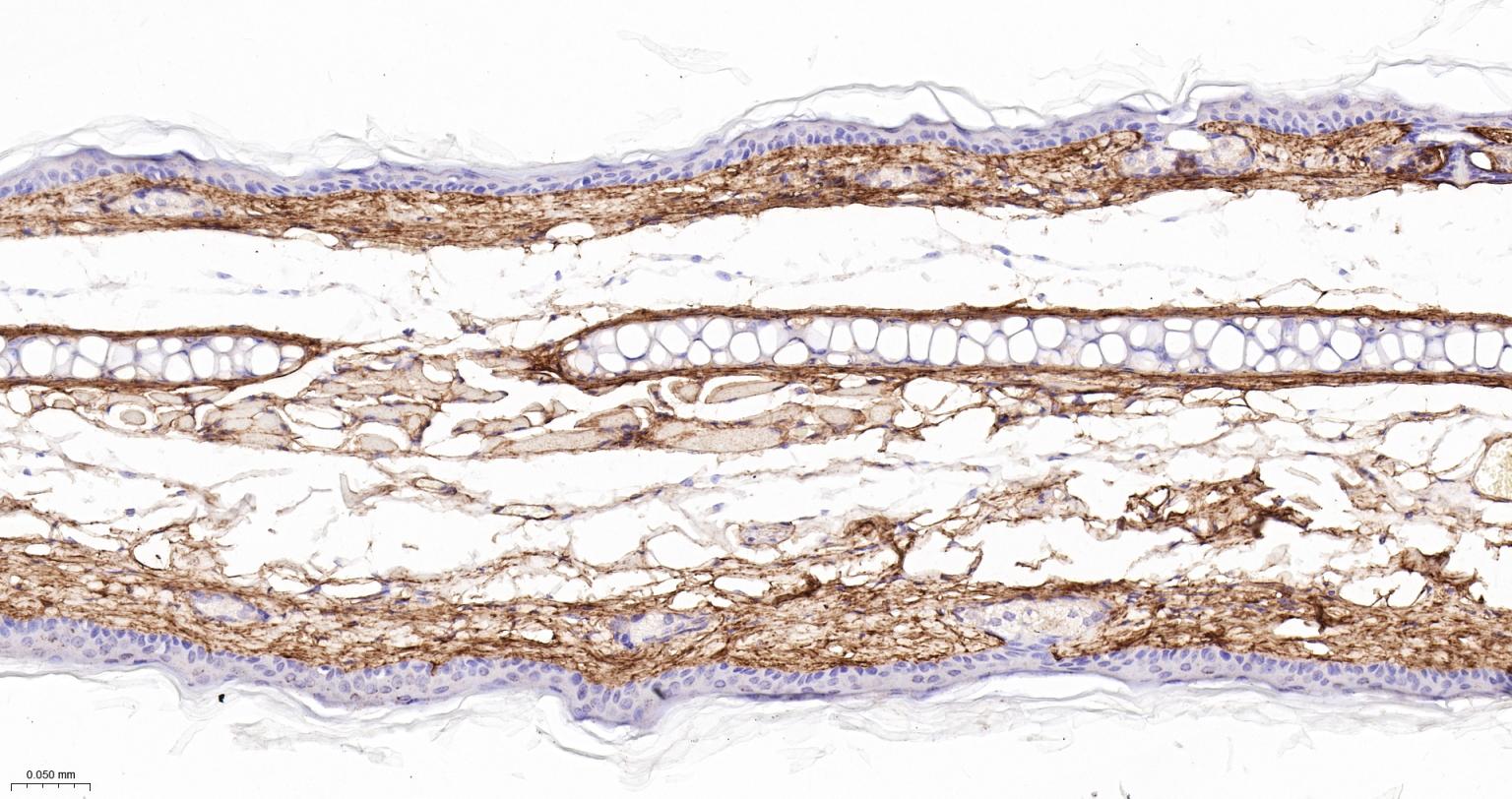 Paraformaldehyde-fixed, paraffin embedded Mouse Skin; Antigen retrieval by boiling in sodium citrate buffer (pH6.0) for 15 min; The section was incubated with Collagen VI Monoclonal Antibody, Unconjugated (bsm-61026R) at 1:200 overnight at 4°C, followed by conjugation to the bs-0295G-HRP and DAB (C-0010) staining.