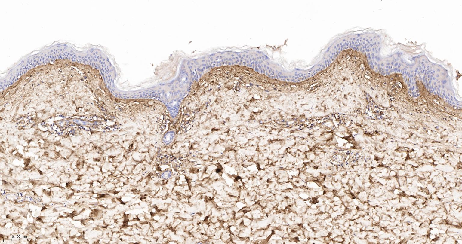 Paraformaldehyde-fixed, paraffin embedded Human Skin; Antigen retrieval by boiling in sodium citrate buffer (pH6.0) for 15 min; The section was incubated with Collagen VI Monoclonal Antibody, Unconjugated (bsm-61026R) at 1:200 overnight at 4°C, followed by conjugation to the bs-0295G-HRP and DAB (C-0010) staining.