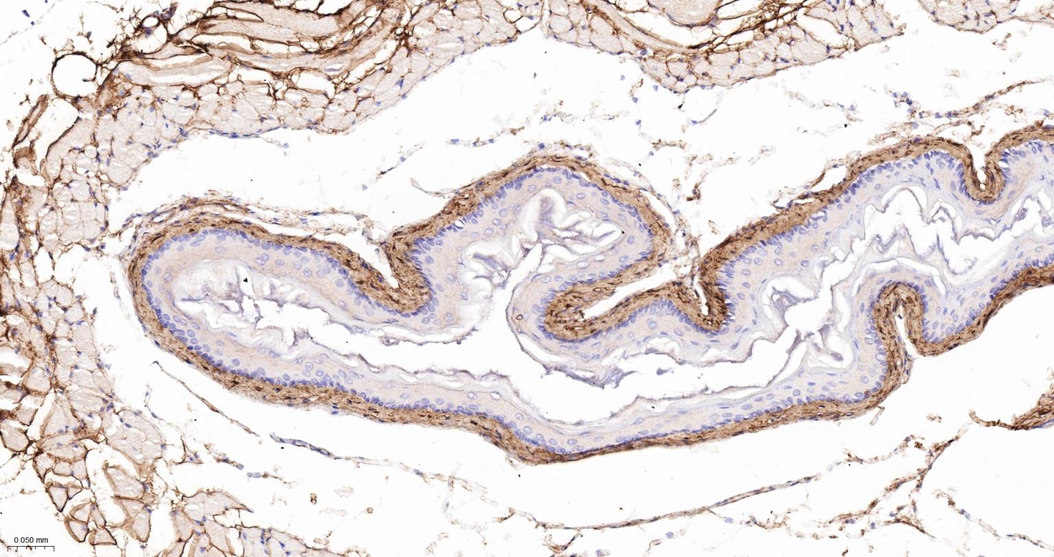 Paraformaldehyde-fixed, paraffin embedded Mouse Esophagus; Antigen retrieval by boiling in sodium citrate buffer (pH6.0) for 15 min; The section was incubated with Collagen VI Monoclonal Antibody, Unconjugated (bsm-61026R) at 1:200 overnight at 4°C, followed by conjugation to the bs-0295G-HRP and DAB (C-0010) staining.