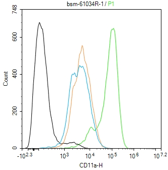 The THP-1 (H) cells were incubated in 5%BSA to block non-specific protein-protein interactions (30 min at r.t.). Primary Antibody (green): Rabbit Anti-CD11a antibody (bsm-61034R): 1 μg/10^6 cells; Secondary Antibody (white blue): Goat anti-Rabbit IgG-FITC (bs-60295G-FITC): 1 μg/test. Isotype Control (orange): Rabbit IgG (bs-0295P). Blank control (black): PBS. Acquisition of 20,000 events was performed.