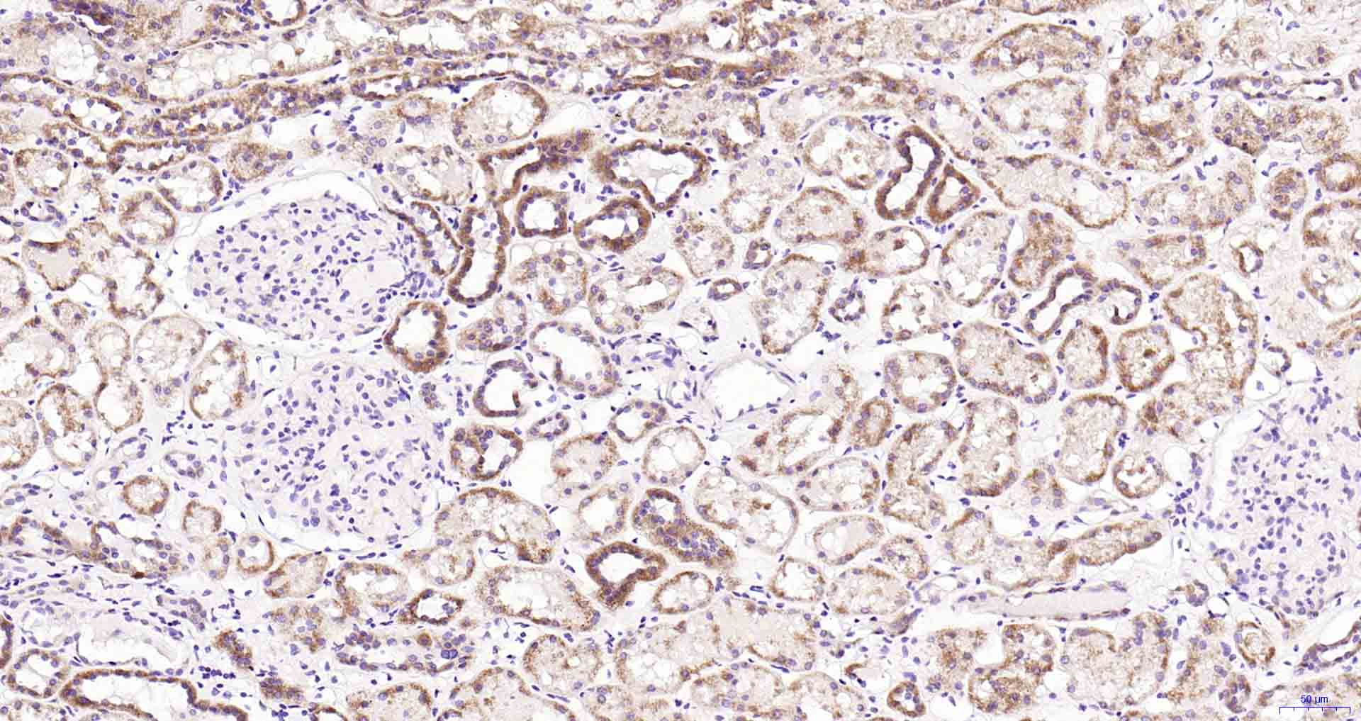 Paraformaldehyde-fixed, paraffin embedded Human Kidney; Antigen retrieval by boiling in sodium citrate buffer (pH6.0) for 15 min; Antibody incubation with ULK1 Monoclonal Antibody, Unconjugated(bsm-61039R) at 1:100 overnight at 4°C, followed by conjugation to the SP Kit(Rabbit, SP-0023) and DAB (C-0010) staining.