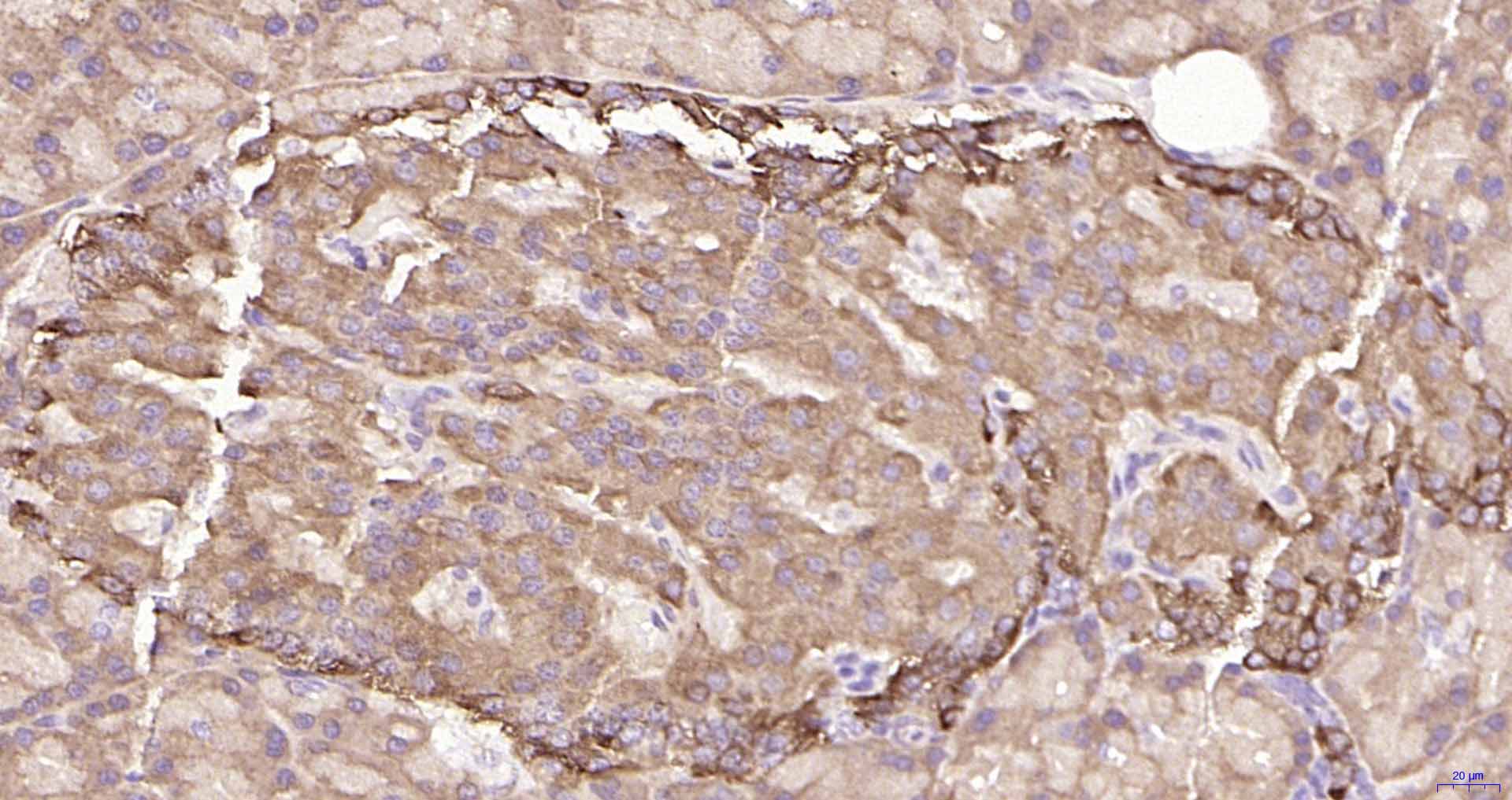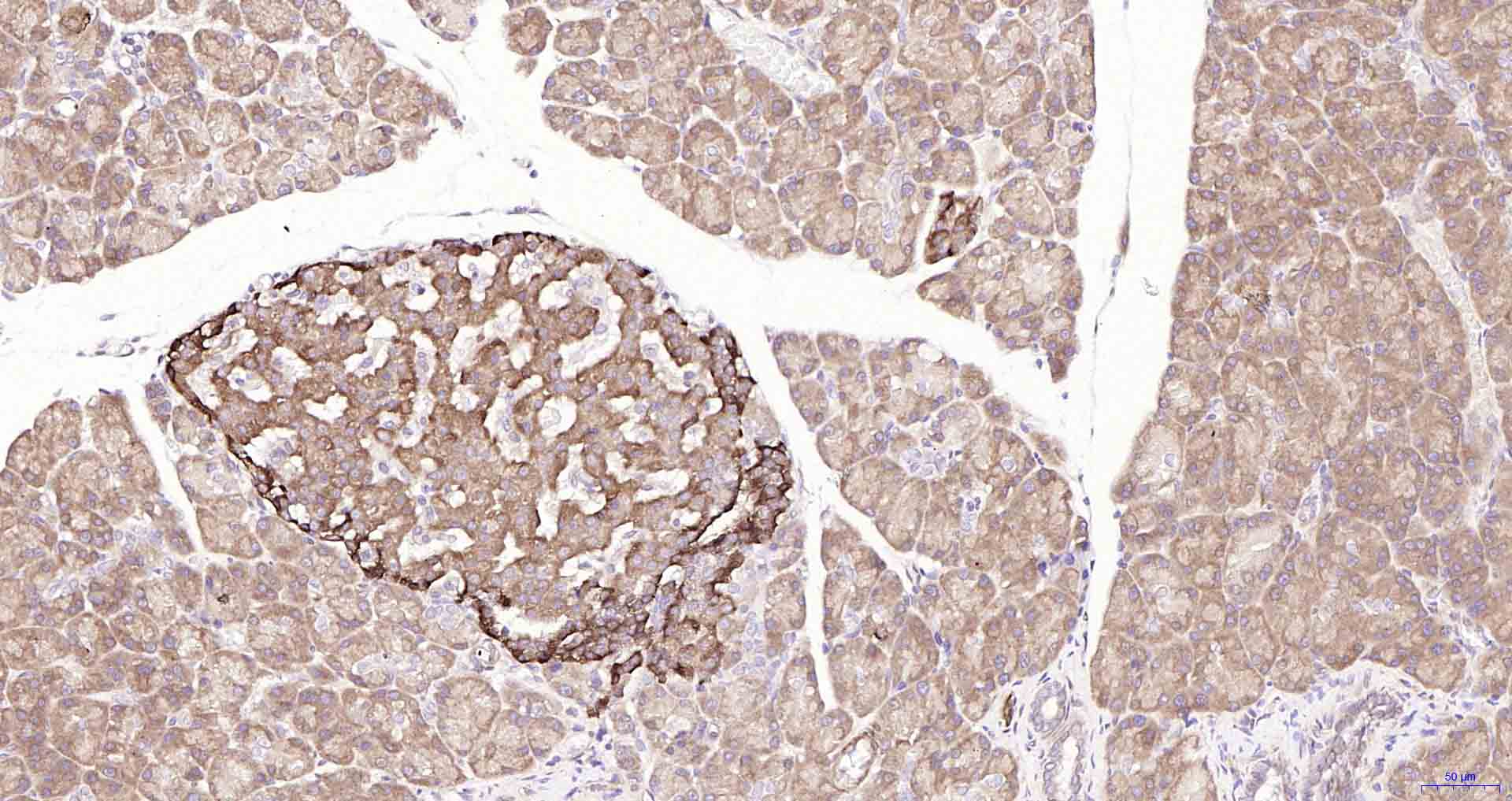 Paraformaldehyde-fixed, paraffin embedded Rat Pancreas; Antigen retrieval by boiling in sodium citrate buffer (pH6.0) for 15 min; Antibody incubation with ULK1 Monoclonal Antibody, Unconjugated(bsm-61039R) at 1:100 overnight at 4°C, followed by conjugation to the SP Kit(Rabbit, SP-0023) and DAB (C-0010) staining.