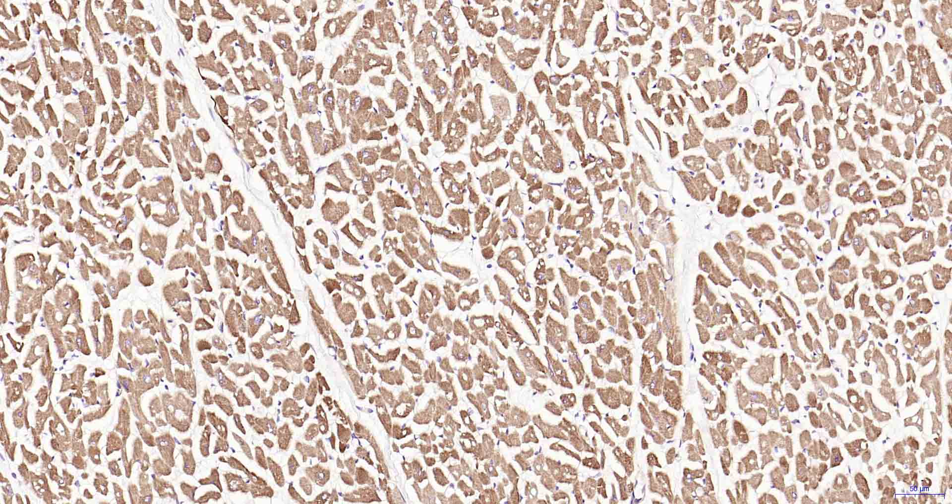 Paraformaldehyde-fixed, paraffin embedded Mouse Heart; Antigen retrieval by boiling in sodium citrate buffer (pH6.0) for 15 min; Antibody incubation with ULK1 Monoclonal Antibody, Unconjugated(bsm-61039R) at 1:100 overnight at 4°C, followed by conjugation to the SP Kit(Rabbit, SP-0023) and DAB (C-0010) staining.