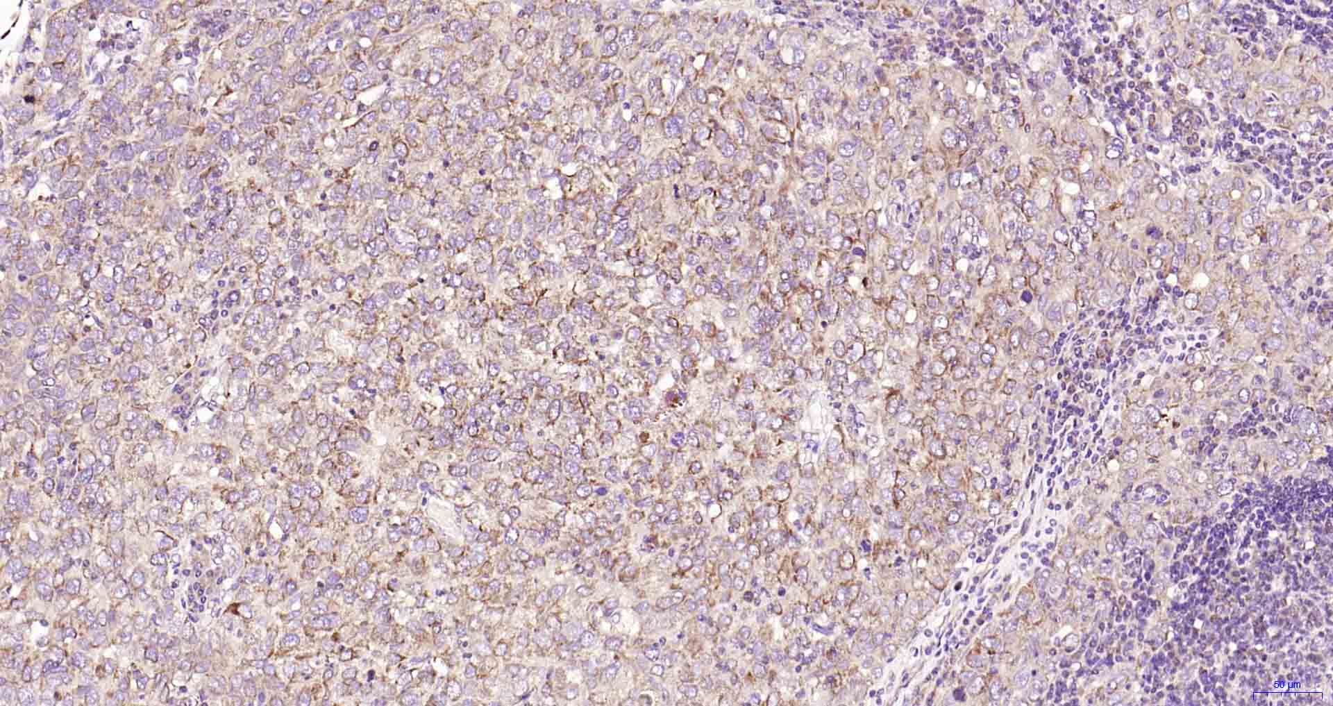 Paraformaldehyde-fixed, paraffin embedded Human Esophageal Cancer; Antigen retrieval by boiling in sodium citrate buffer (pH6.0) for 15 min; Antibody incubation with ULK1 Monoclonal Antibody, Unconjugated(bsm-61039R) at 1:100 overnight at 4°C, followed by conjugation to the SP Kit(Rabbit, SP-0023) and DAB (C-0010) staining.