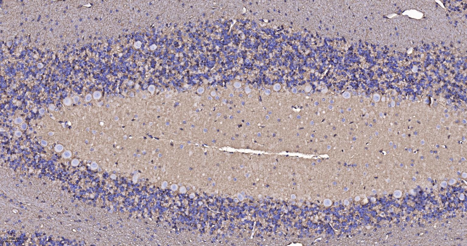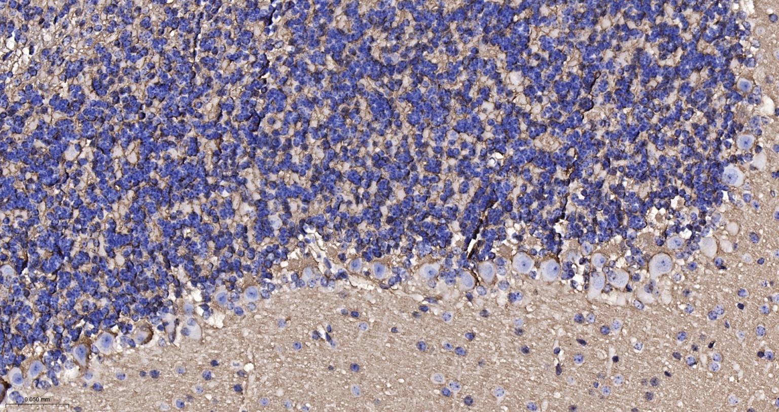 Paraformaldehyde-fixed, paraffin embedded Mouse Cerebellum; Antigen retrieval by boiling in sodium citrate buffer (pH6.0) for 15 min; Antibody incubation with AQP4 Monoclonal Antibody, Unconjugated(bsm-61035R) at 1:100 overnight at 4°C, followed by conjugation to the SP Kit (Rabbit, SP-0023) and DAB (C-0010) staining.