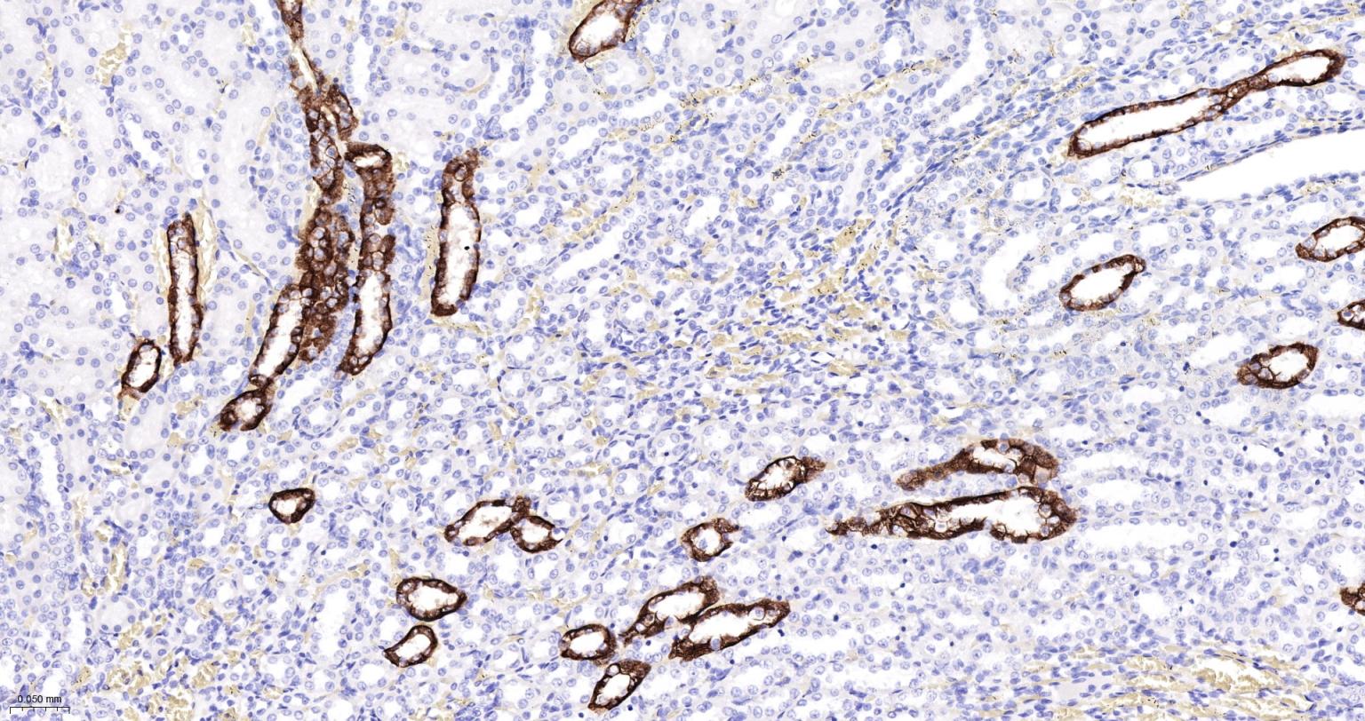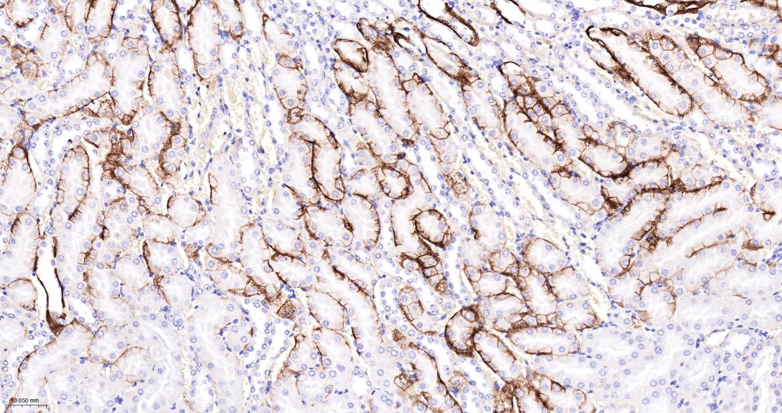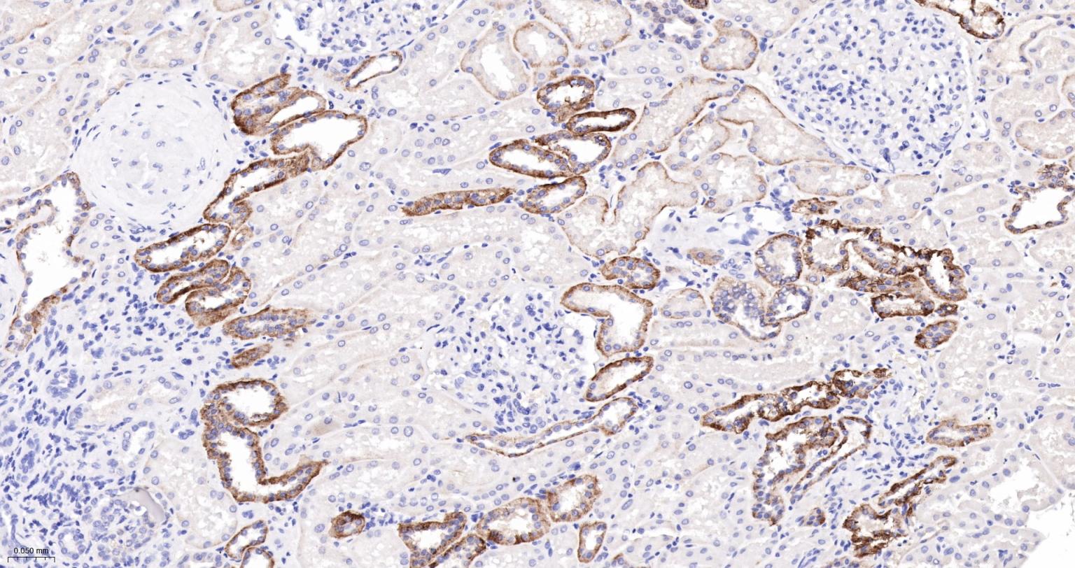 Paraformaldehyde-fixed, paraffin embedded Human Kidney; Antigen retrieval by boiling in sodium citrate buffer (pH6.0) for 15 min; The section was incubated with AQP4 Monoclonal Antibody, Unconjugated (bsm-61035R) at 1:200 overnight at 4°C, followed by conjugation to the bs-0295G-HRP and DAB (C-0010) staining.