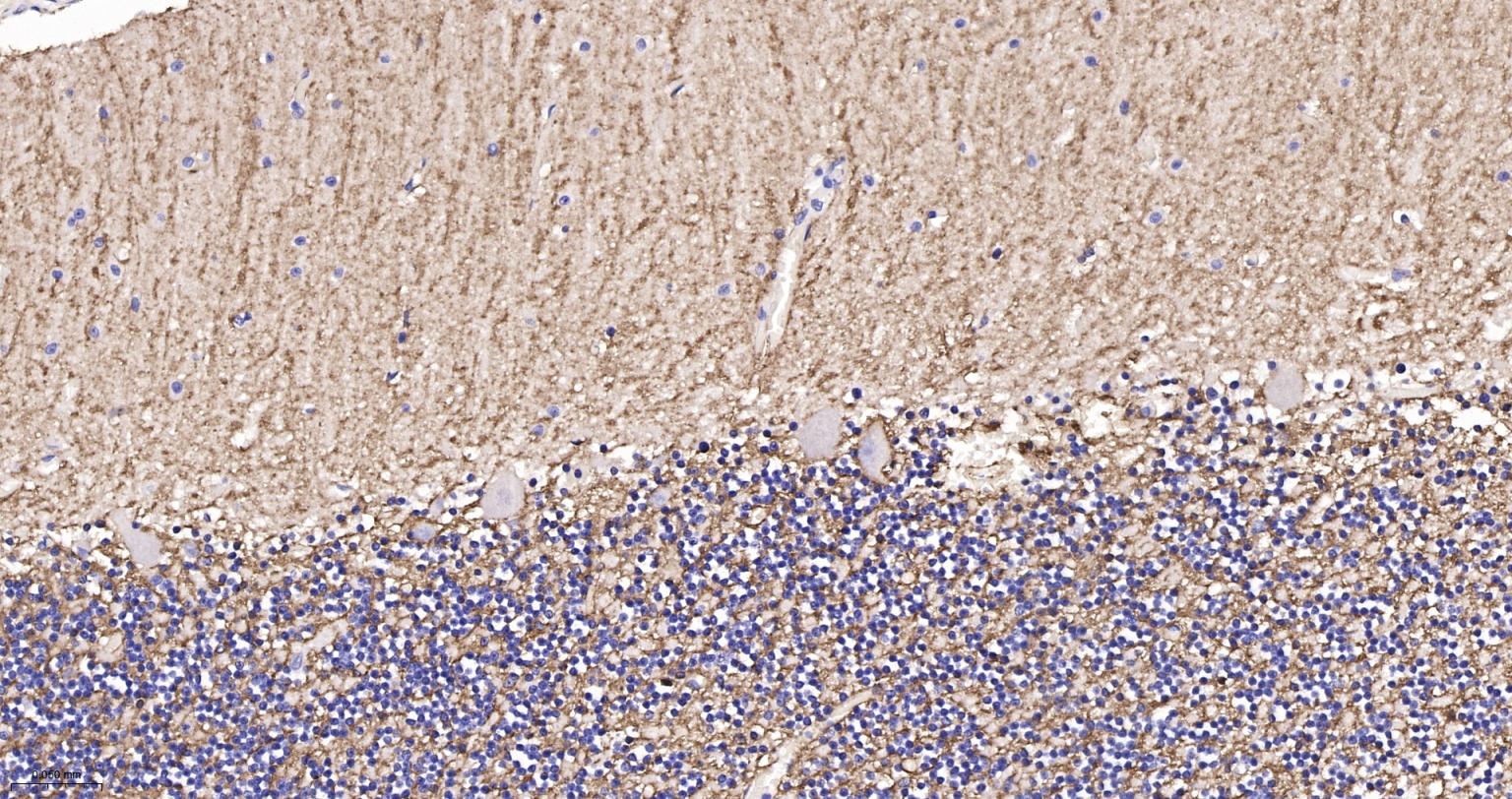 Paraformaldehyde-fixed, paraffin embedded Rat Cerebellum; Antigen retrieval by boiling in sodium citrate buffer (pH6.0) for 15 min; Antibody incubation with AQP4 Monoclonal Antibody, Unconjugated(bsm-61035R) at 1:100 overnight at 4°C, followed by conjugation to the SP Kit (Rabbit, SP-0023) and DAB (C-0010) staining.