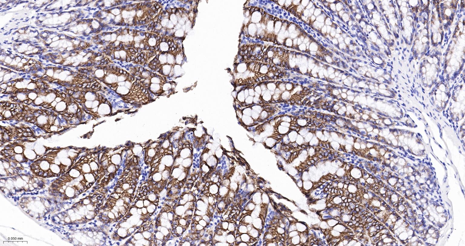 Paraformaldehyde-fixed, paraffin embedded Mouse Colon; Antigen retrieval by boiling in sodium citrate buffer (pH6.0) for 15 min; The section was incubated with AQP4 Monoclonal Antibody, Unconjugated (bsm-61035R) at 1:200 overnight at 4°C, followed by conjugation to the bs-0295G-HRP and DAB (C-0010) staining.