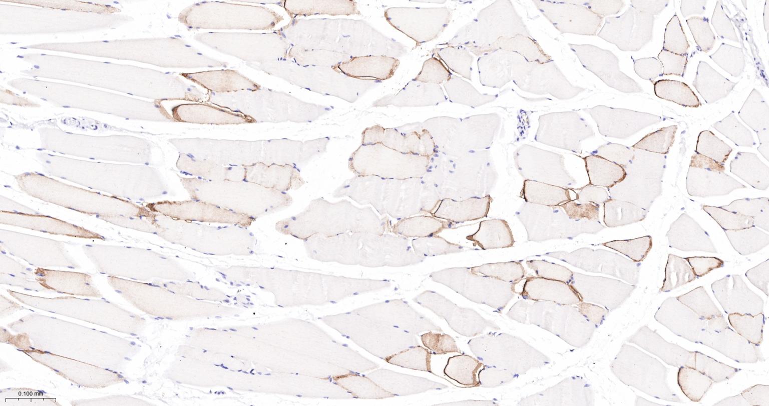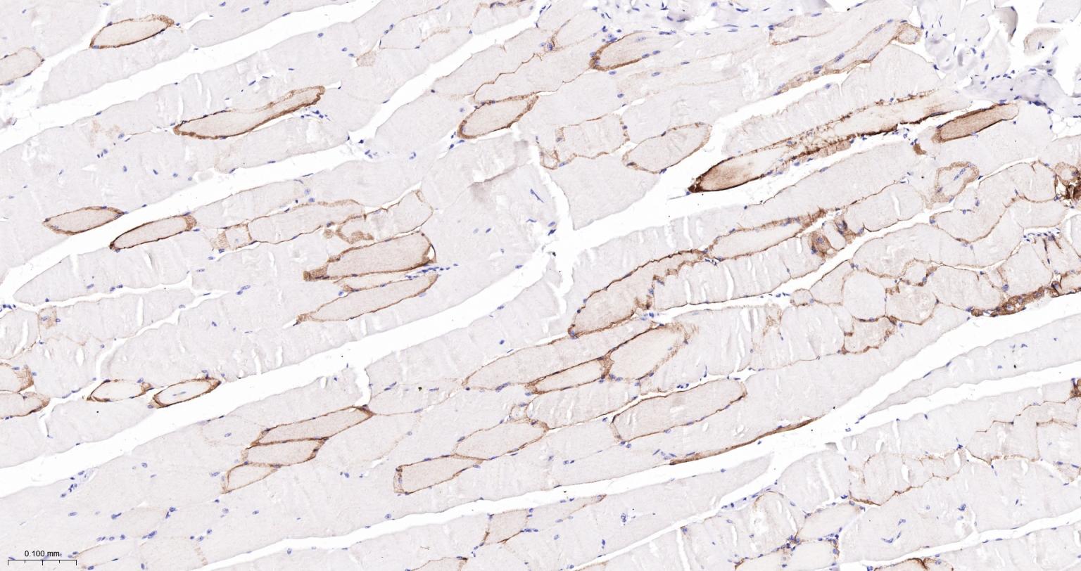 Paraformaldehyde-fixed, paraffin embedded Rat Skeletal muscle; Antigen retrieval by boiling in sodium citrate buffer (pH6.0) for 15 min; The section was incubated with AQP4 Monoclonal Antibody, Unconjugated (bsm-61035R) at 1:200 overnight at 4°C, followed by conjugation to the bs-0295G-HRP and DAB (C-0010) staining.