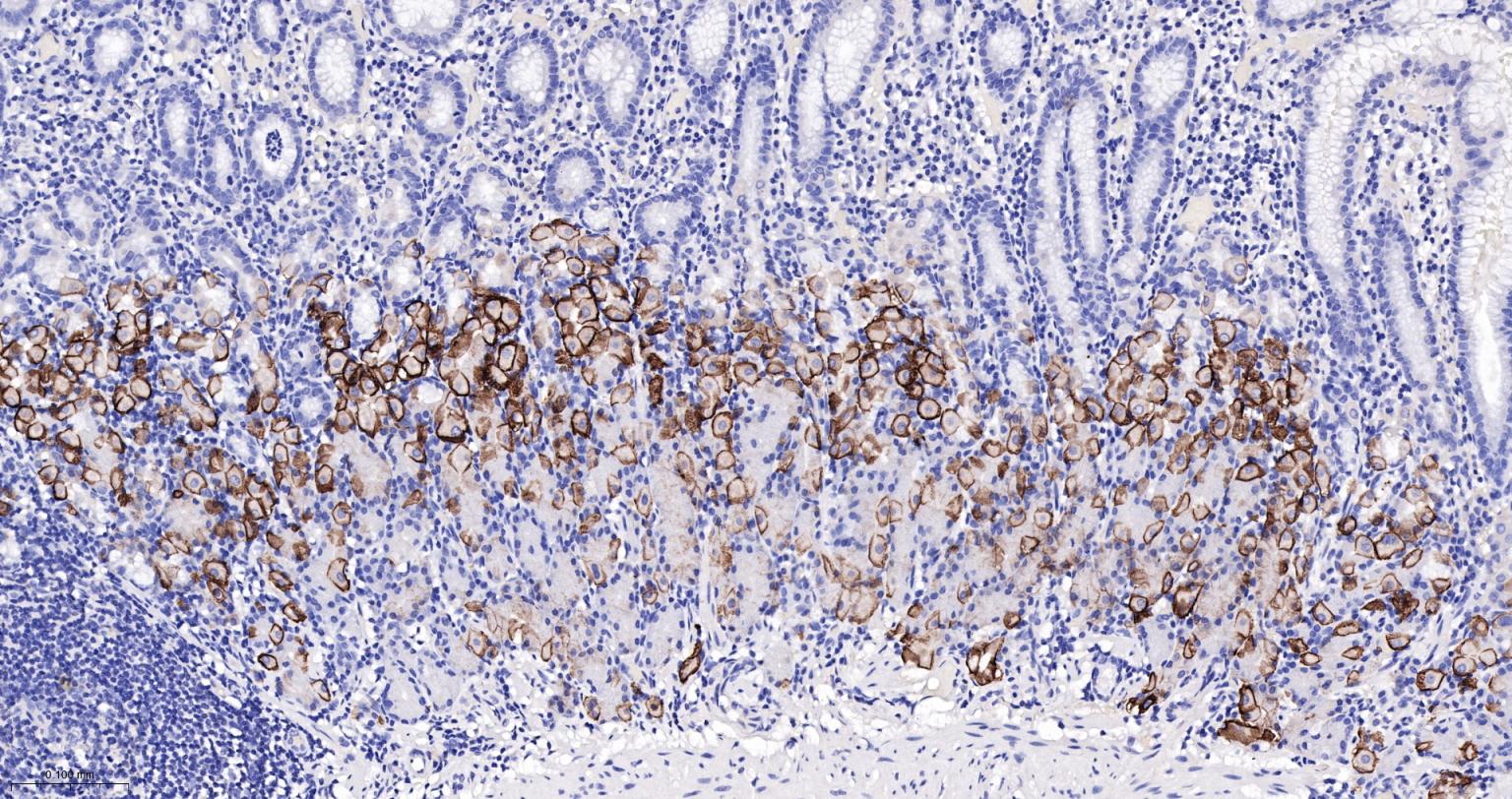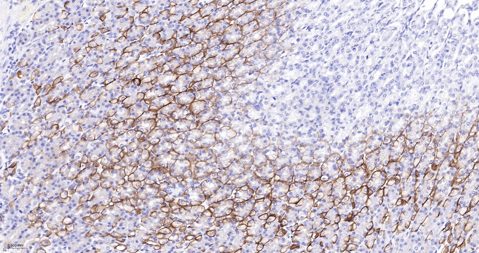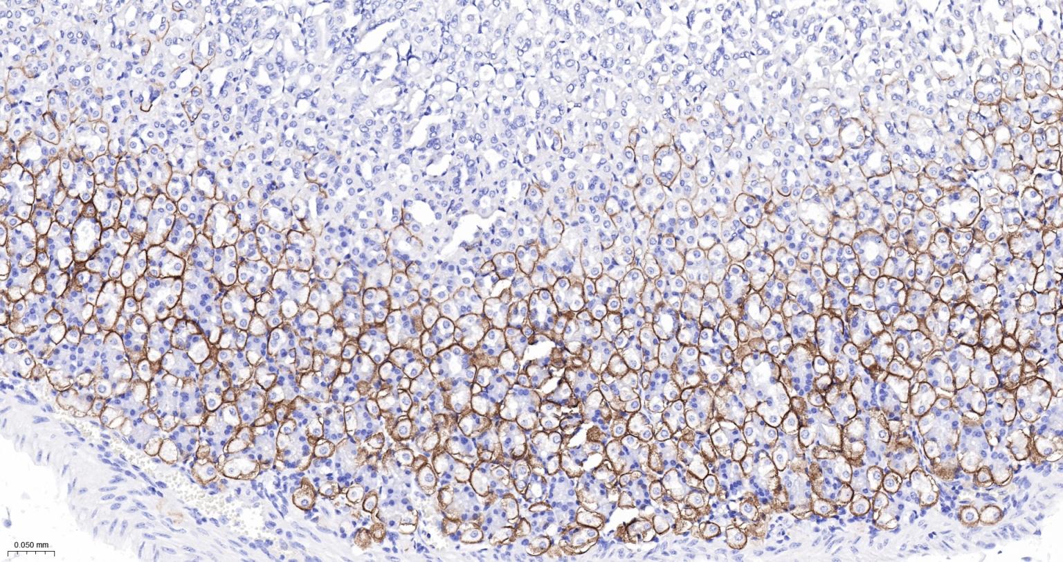 Paraformaldehyde-fixed, paraffin embedded Rat Stomach; Antigen retrieval by boiling in sodium citrate buffer (pH6.0) for 15 min; The section was incubated with AQP4 Monoclonal Antibody, Unconjugated (bsm-61035R) at 1:200 overnight at 4°C, followed by conjugation to the bs-0295G-HRP and DAB (C-0010) staining.