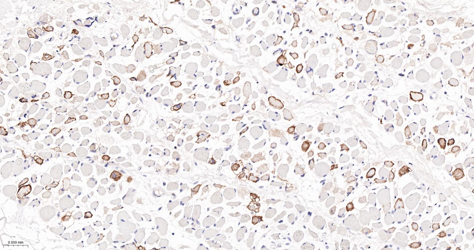 Paraformaldehyde-fixed, paraffin embedded Human Skeletal muscle; Antigen retrieval by boiling in sodium citrate buffer (pH6.0) for 15 min; The section was incubated with AQP4 Monoclonal Antibody, Unconjugated (bsm-61035R) at 1:200 overnight at 4°C, followed by conjugation to the bs-0295G-HRP and DAB (C-0010) staining.