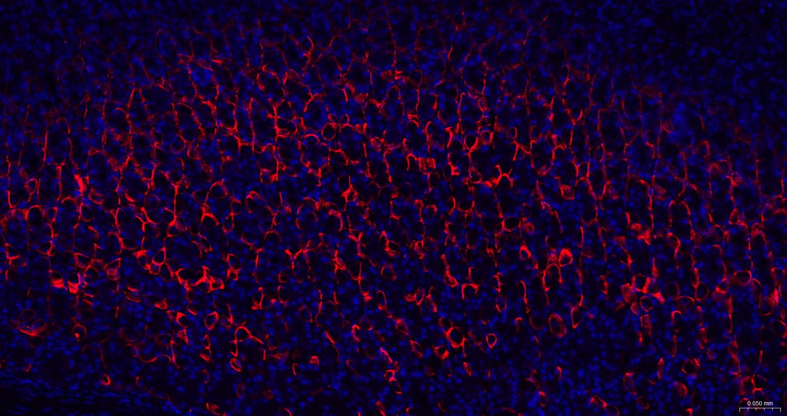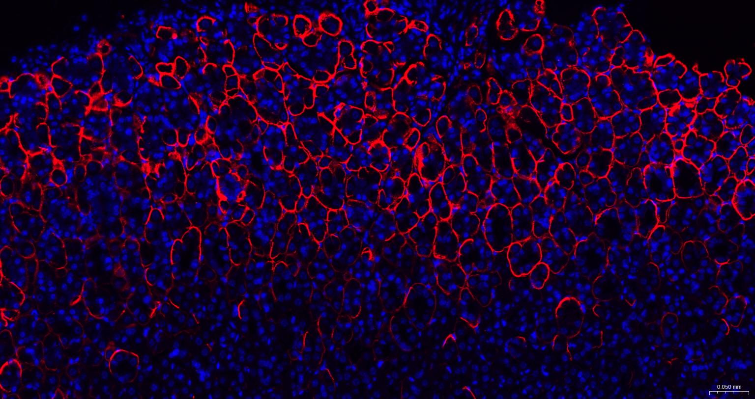 Paraformaldehyde-fixed, paraffin embedded Rat Stomach; Antigen retrieval by boiling in sodium citrate buffer (pH6.0) for 15 min; The section was incubated with AQP4 Monoclonal Antibody, Unconjugated (bsm-61035R) at 1:200 overnight at 4°C. Followed by conjugated Goat Anti-Rabbit IgG antibody (Red, bs-0295G-BF594), DAPI (blue, C02-04002) was used to stain the cell nuclei.
