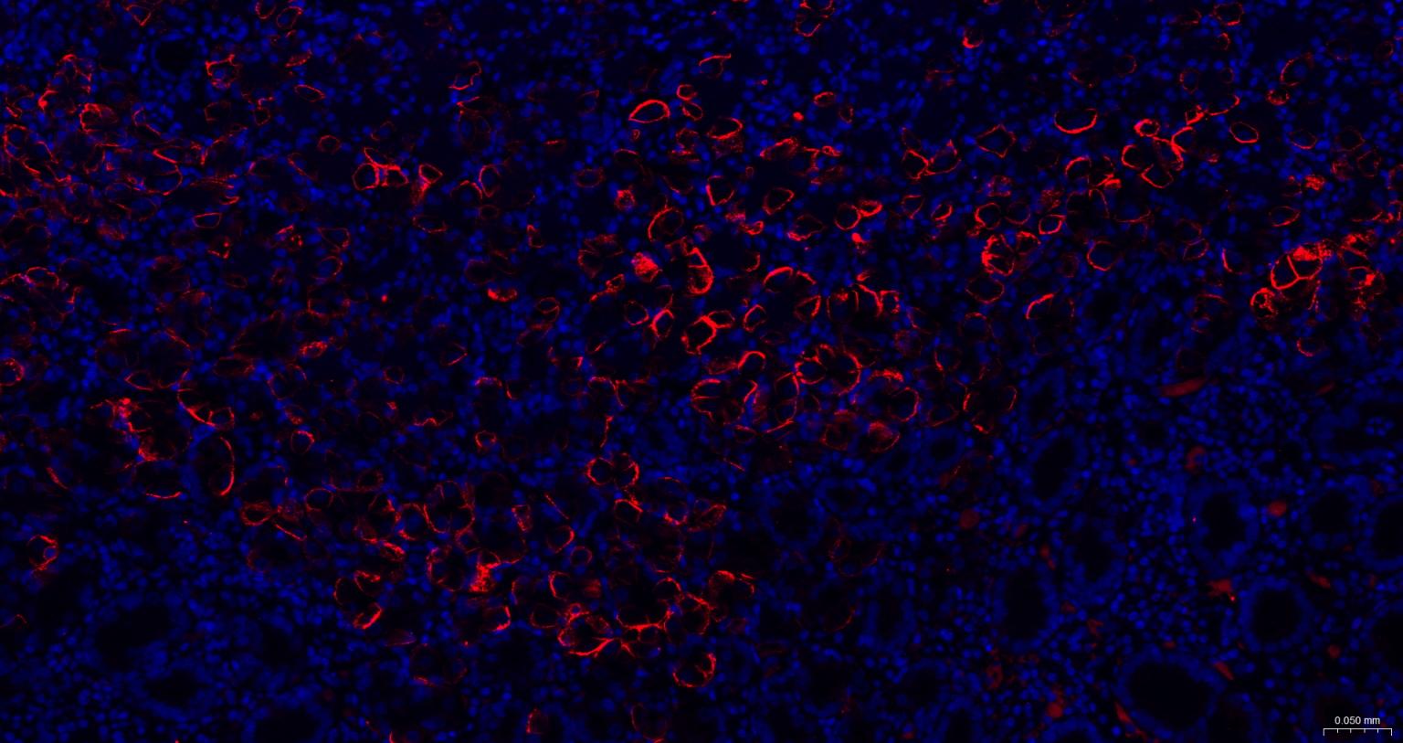 Paraformaldehyde-fixed, paraffin embedded Human Stomach; Antigen retrieval by boiling in sodium citrate buffer (pH6.0) for 15 min; The section was incubated with AQP4 Monoclonal Antibody, Unconjugated (bsm-61035R) at 1:200 overnight at 4°C. Followed by conjugated Goat Anti-Rabbit IgG antibody (Red, bs-0295G-BF594), DAPI (blue, C02-04002) was used to stain the cell nuclei.