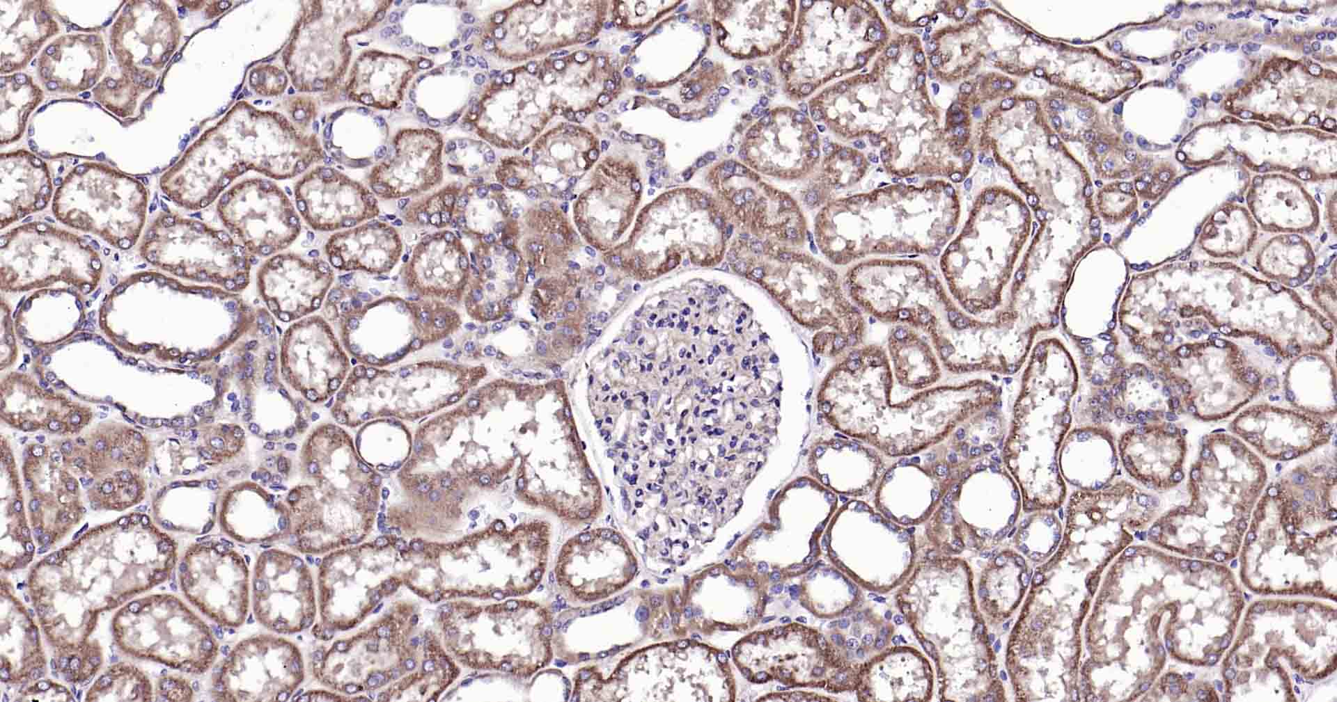Paraformaldehyde-fixed, paraffin embedded Human Kidney; Antigen retrieval by boiling in sodium citrate buffer (pH6.0) for 15 min; Antibody incubation with RalA Monoclonal Antibody, Unconjugated(bsm-61044R) at 1:200 overnight at 4°C, followed by conjugation to the SP Kit (Rabbit, SP-0023) and DAB (C-0010) staining.