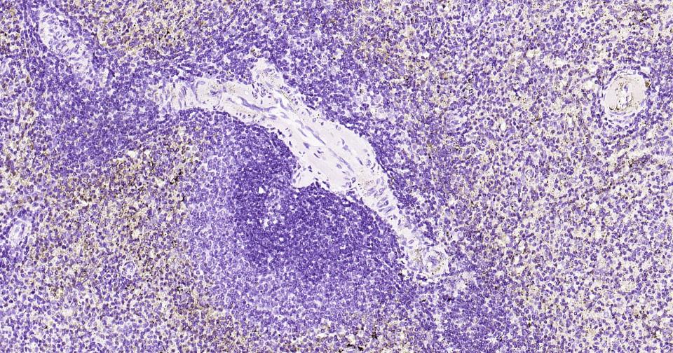 (Negative control)Paraformaldehyde-fixed, paraffin embedded Rat Spleen; Antigen retrieval by boiling in sodium citrate buffer (pH6.0) for 15 min; Antibody incubation with Tau-4 Monoclonal Antibody, Unconjugated(bsm-41804M) at 1:600 overnight at 4°C, followed by conjugation to the SP Kit (Mouse, sp-0024) and DAB (C-0010) staining.