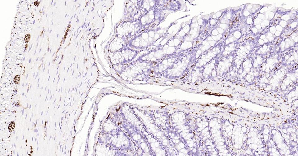 Paraformaldehyde-fixed, paraffin embedded Rat Colon; Antigen retrieval by boiling in sodium citrate buffer (pH6.0) for 15 min; Antibody incubation with Tau-4 Monoclonal Antibody, Unconjugated(bsm-41804M) at 1:600 overnight at 4°C, followed by conjugation to the SP Kit (Mouse, sp-0024) and DAB (C-0010) staining.