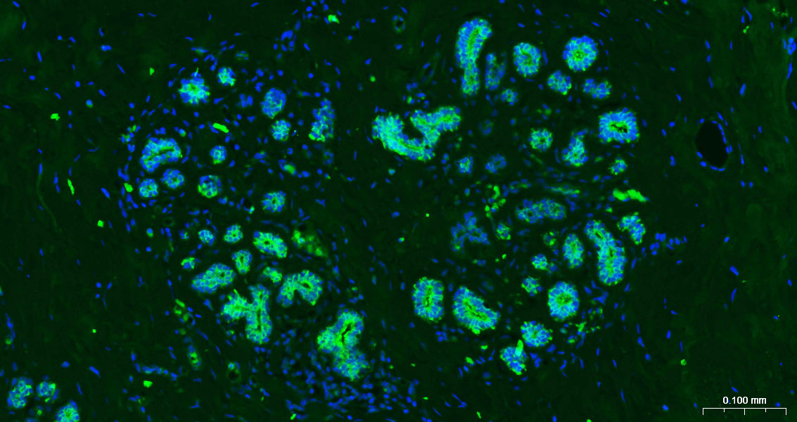 Paraformaldehyde-fixed, paraffin embedded Human Breast; Antigen retrieval by boiling in sodium citrate buffer (pH6.0) for 15 min; Antibody incubation with Tau-4 Monoclonal Antibody, Unconjugated (bsm-41802M) at 1:200 overnight at 4°C. Followed by conjugated Goat Anti-Mouse IgG antibody (green, bs-0296G-BF488), DAPI (blue, C02-04002) was used to stain the cell nuclei.