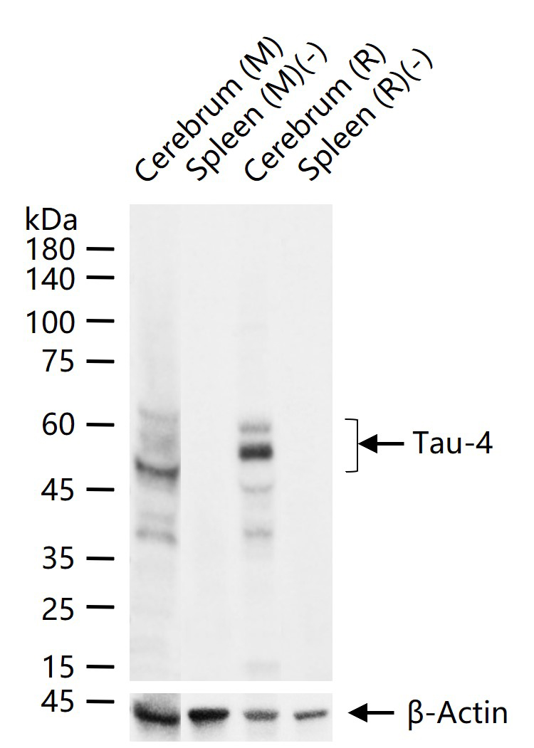 25 ug total protein per lane of various lysates (see on figure) probed with Tau-4 monoclonal antibody, unconjugated (bsm-41802M) at 1:1000 dilution and 4°C overnight incubation. Followed by conjugated secondary antibody incubation at r.t. for 60 min.