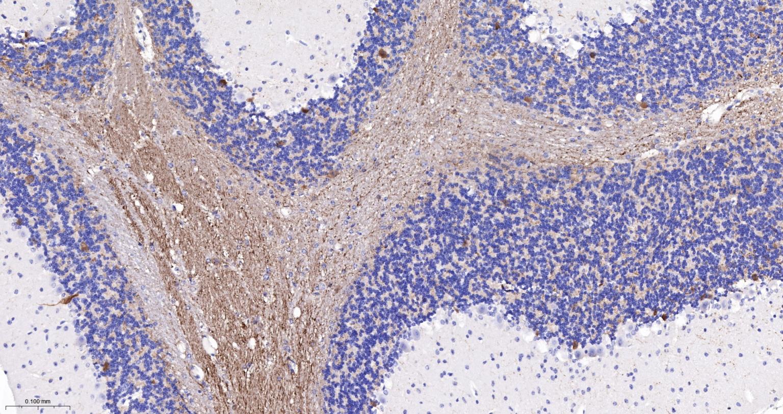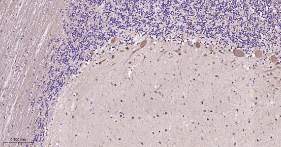 Paraformaldehyde-fixed, paraffin embedded Mouse Cerebellum; Antigen retrieval by boiling in sodium citrate buffer (pH6.0) for 15 min; Antibody incubation with PGP9.5 Monoclonal Antibody, Unconjugated(bsm-41257R) at 1:1500 overnight at 4°C, followed by conjugation to the bs-0295G-HRP and DAB (C-0010) staining.