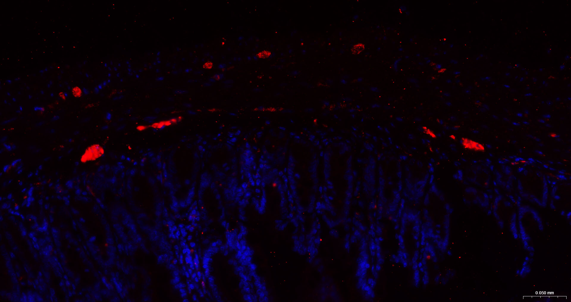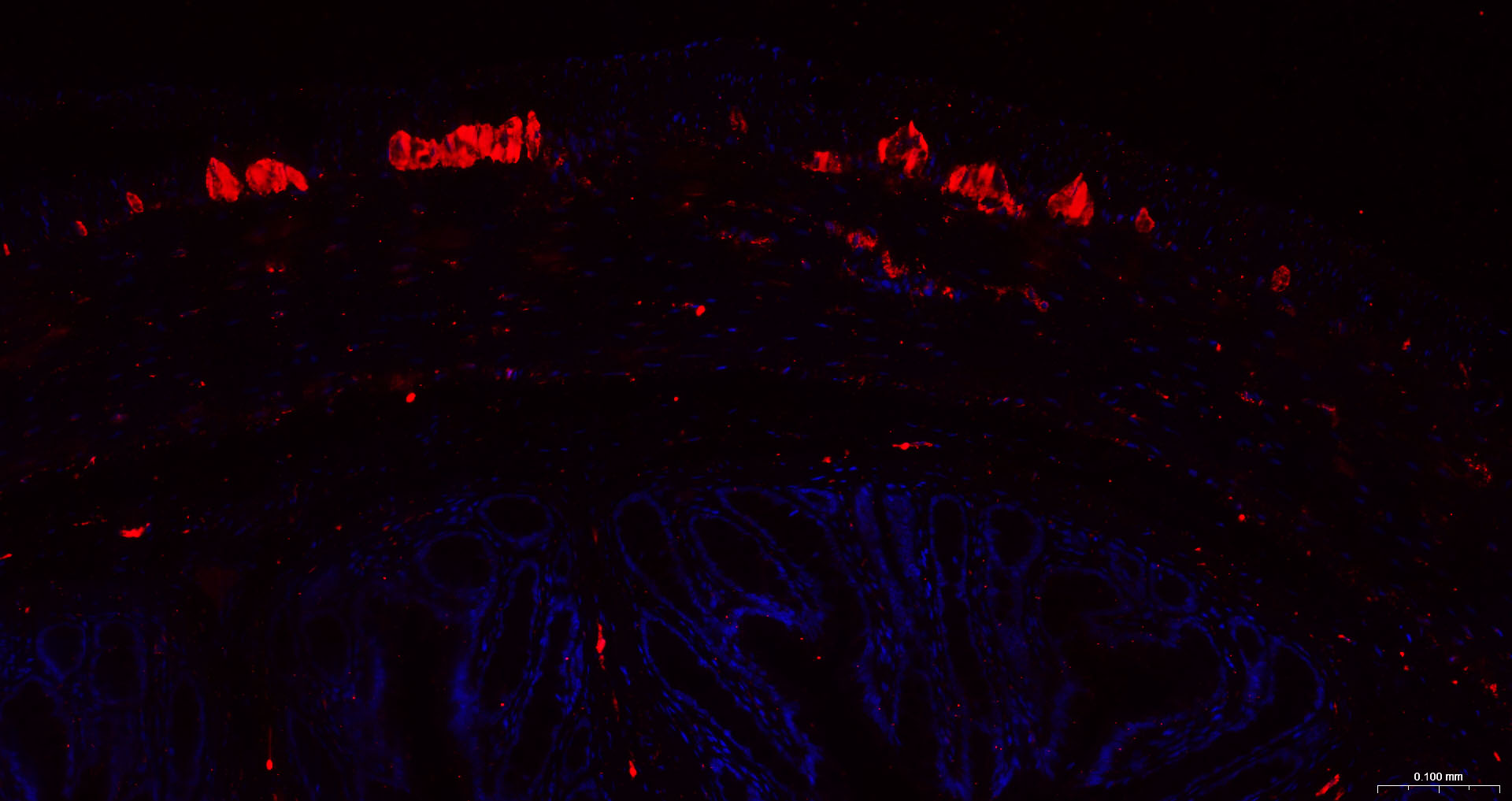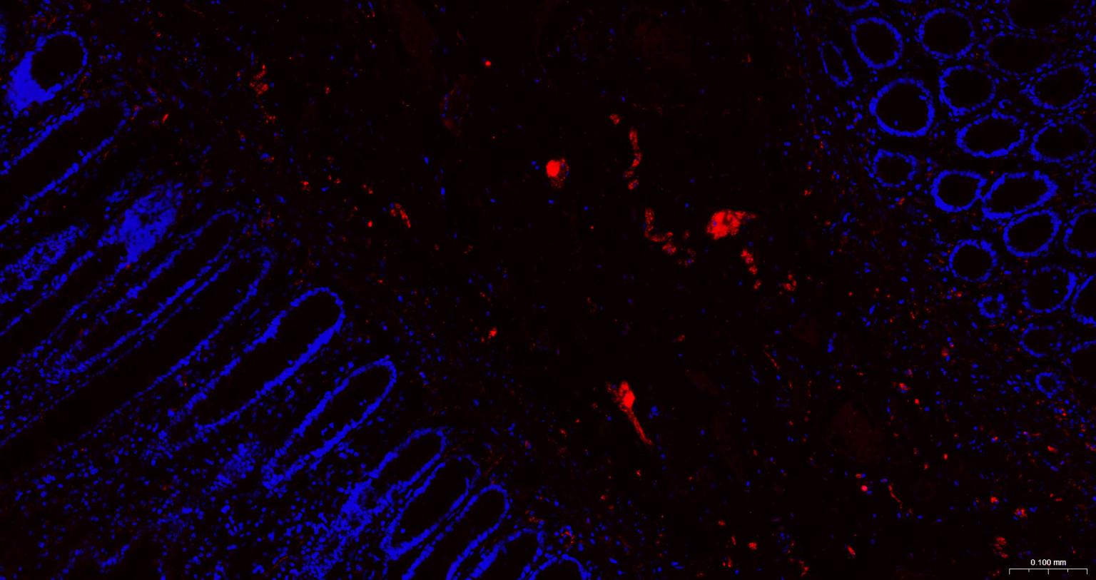 Paraformaldehyde-fixed, paraffin embedded Mouse Colon; Antigen retrieval by boiling in sodium citrate buffer (pH6.0) for 15 min; The section was incubated with PGP9.5 Monoclonal Antibody, Unconjugated (bsm-41257R) at 1:200 overnight at 4°C. Followed by conjugated Goat Anti-Rabbit IgG antibody (Red, bs-0295G-BF594), DAPI (blue, C02-04002) was used to stain the cell nuclei.