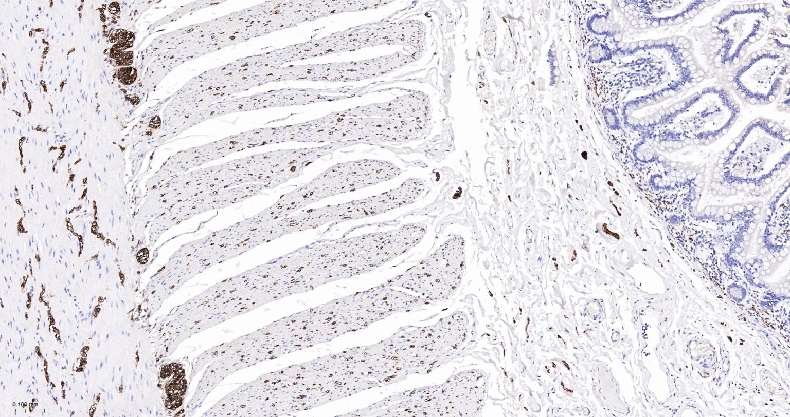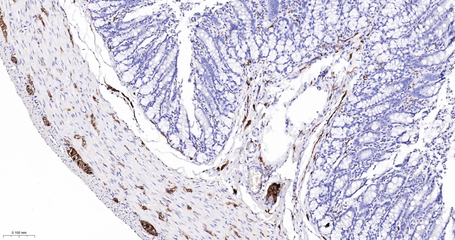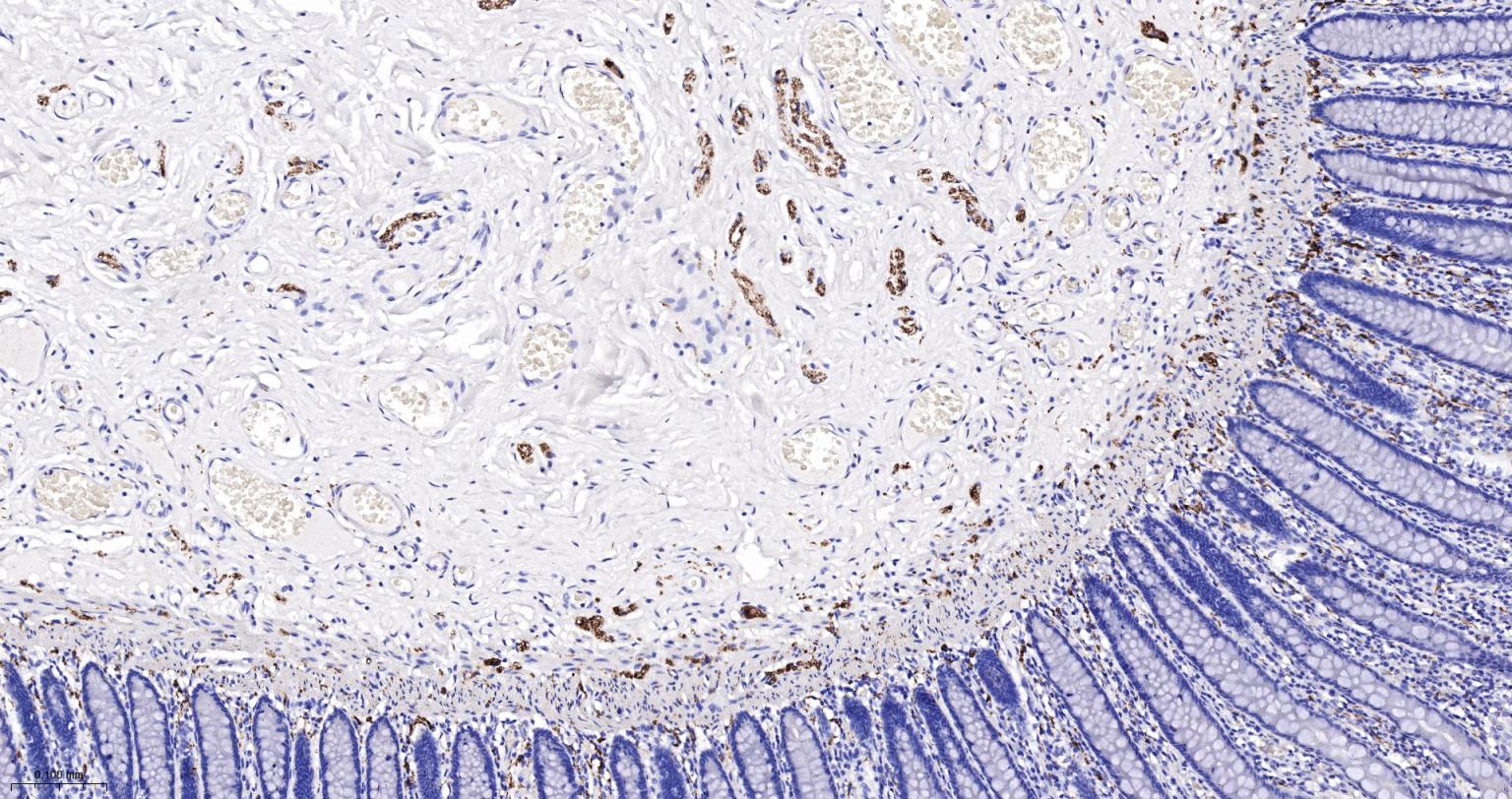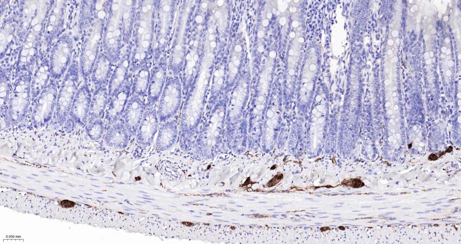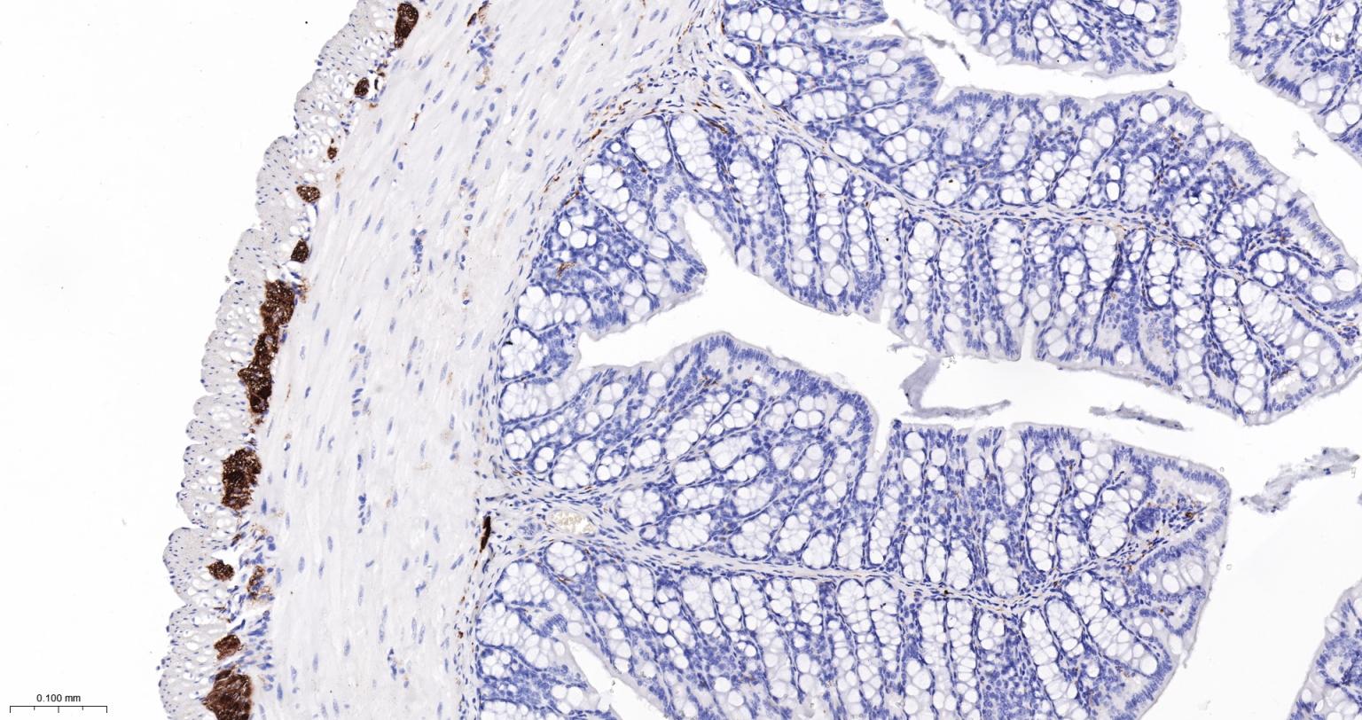 Paraformaldehyde-fixed, paraffin embedded Mouse Colon; Antigen retrieval by boiling in sodium citrate buffer (pH6.0) for 15 min; Antibody incubation with PGP9.5 Monoclonal Antibody, Unconjugated(bsm-41257R) at 1:1500 overnight at 4°C, followed by conjugation to the bs-0295G-HRP and DAB (C-0010) staining.