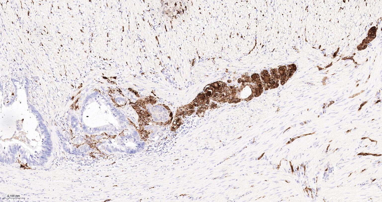 Paraformaldehyde-fixed, paraffin embedded Human Colon Cancer; Antigen retrieval by boiling in sodium citrate buffer (pH6.0) for 15 min; Antibody incubation with PGP9.5 Monoclonal Antibody, Unconjugated(bsm-41257R) at 1:1500 overnight at 4°C, followed by conjugation to the bs-0295G-HRP and DAB (C-0010) staining.